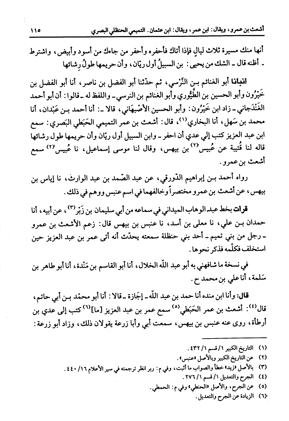 أنها منك مسيرة ثلاث ليال فإذا أتاك فأحفره وأحفر من جاءك من أسود وأبيض واشترط أطنه قال الشك من يحيى بن السبيل أول ريان وأن حريمها طول رشائها أنبأنا أبو الغنائم بن النرسي ثم حدثنا أبو الفضل بن ناصر أنا أبو الفضل بن خيرون وأبو الحسين بن الطيوري وأبو الغنائم بن النرسي واللفظ له قالوا أن أبو أحمد الغندجاني زاد ابن خيرون وأبو الحسين الأصبهاني قالا أنا أحمد بن عبدان أنا محمد بن سهل أنا البخاري (1) قال أشعث بن عمر التميمي الحبطي البصري سمع ابن عبد العزيز كتب إلي عدي أن احفر وابن السبيل أول ريان وأن حريمها طول رشأئها قاله لنا قتيبة عن عبيس بن بيهس وقال لنا موسى إسماعيل نا عبيس (2) سمع أشعث بن عمرو رواه أحمد بن إبراهيم الدورقي عن عبد الصمد بن عبد الوارث نا إياس بن بيهس عن أشعث بن عمرو مختصرا وخالفهما في اسم عنبس ووهم في ذلك قرأت بخط عبد الوهاب الميداني في سماعه من أبي سليمان بن زبر (3) عن أبيه أنا حمدان بن علي نا معلى بن أسد نا عنبس بن بيهس قال زعم الأشعث بن عمرو رجل من بني تميم أحد بني حنظلة سمعته يحدث أنه أتى عمر بن عبد العزيز حين استخلف فكلمه فذكر نحوها في نسخة ما شافهني به أبو عبد الله الخلال أنا أبو القاسم بن مندة أنا أبو طاهر بن سلمة أنا علي بن محمد قال وأنا ابن منده أنا حمد بن عبد الله إجازة قالا أنا أبو محمد بن أبي حاتم قال أشعث بن عمر الحبطي سمع عمر بن عبد العزيز ما كتب إلى عدي بن أرطأة روى عنه عنبس بن بيهس سمعت أبي وأبا زرعة يقولان ذلك وزاد أبو زرعة