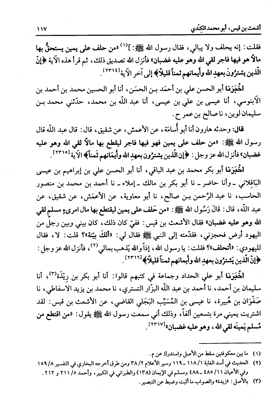 فقلت إنه يحلف ولا يبالي فقال رسول الله (صلى الله عليه وسلم) (1) من حلف على يمين يستحق بها مالا هو فيها فاجر لقي الله وهو عليه غضبان فأنزل الله تصديق ذلك ثم قرأ هذه الآية " إن الذين يشترون بعهد الله وأيمانهم ثمنا قليلا " إلى آخر الآية ح أخبرنا أبو الحسن علي بن أحمد بن الحسن أنا أبو الحسين محمد بن أحمد بن الآبنوسي أنا عيسى بن علي بن عيسى أنا عبد الله بن محمد حدثني محمد بن سليمان لوين نا صالح بن عمر قال وحدثه هارون أنا أبو أسامة عن الأعمش عن شقيق قال قال عبد الله قال رسول الله (صلى الله عليه وسلم) من حلف على يمين فهو فيها فاجر ليقطع بها مالا لقي الله وهو عليه غضبان فأنزل الله عز وجل (إن الذين يشترون بعهد الله وأيمانهم ثمنا " الآية أخبرنا أبو بكر محمد بن عبد الباقي أنا أبو الحسن علي بن إبراهيم بن عيسى الباقلاني وأنا حاضر نا أبو بكر بن مالك إملاء نا احمد بن محمد بن منصور الحاسب نا عبد الرحمن بن صالح نا أبو معاوية عن الأعمش عن شقيق عن عبد الله قال رسول الله (صلى الله عليه وسلم) من حلف على يمين ليقتطع بها مال امرئ مسلم لقي الله وهو عليه غضبان فقال الأشعث بن قيس ففي كان ذلك كان بيني وبين رجل من اليهود أرض فحجزني فقدمته إلى النبي (صلى الله عليه وسلم) فقال لي ألك بينة قلت لا فقال لليهود أتحلف فقلت يا رسول الله إذا والله يذهب بمالي (2) فأنزل الله عز وجل " إن الذين يشترون بعهد الله وأيمانهم ثمنا قليلا " أخبرنا أبو علي الحداد وجماعة في كتبهم قالوا أنا أبو بكر بن ريذة (3) أنا سليمان بن أحمد نا أحمد بن عبد الله البزار التستري نا محمد بن يزيد الأسفاطي نا صفوان بن هبيرة نا عيسى بن المسيب البجلي القاضي عن الأشعث بن قيس لقد اشتريت يميني مرة بتسعين ألفا وذلك أني سمعت رسول الله (صلى الله عليه وسلم) يقول من اقتطع من مسلم يمينه لقي الله وهو عليه غضبان