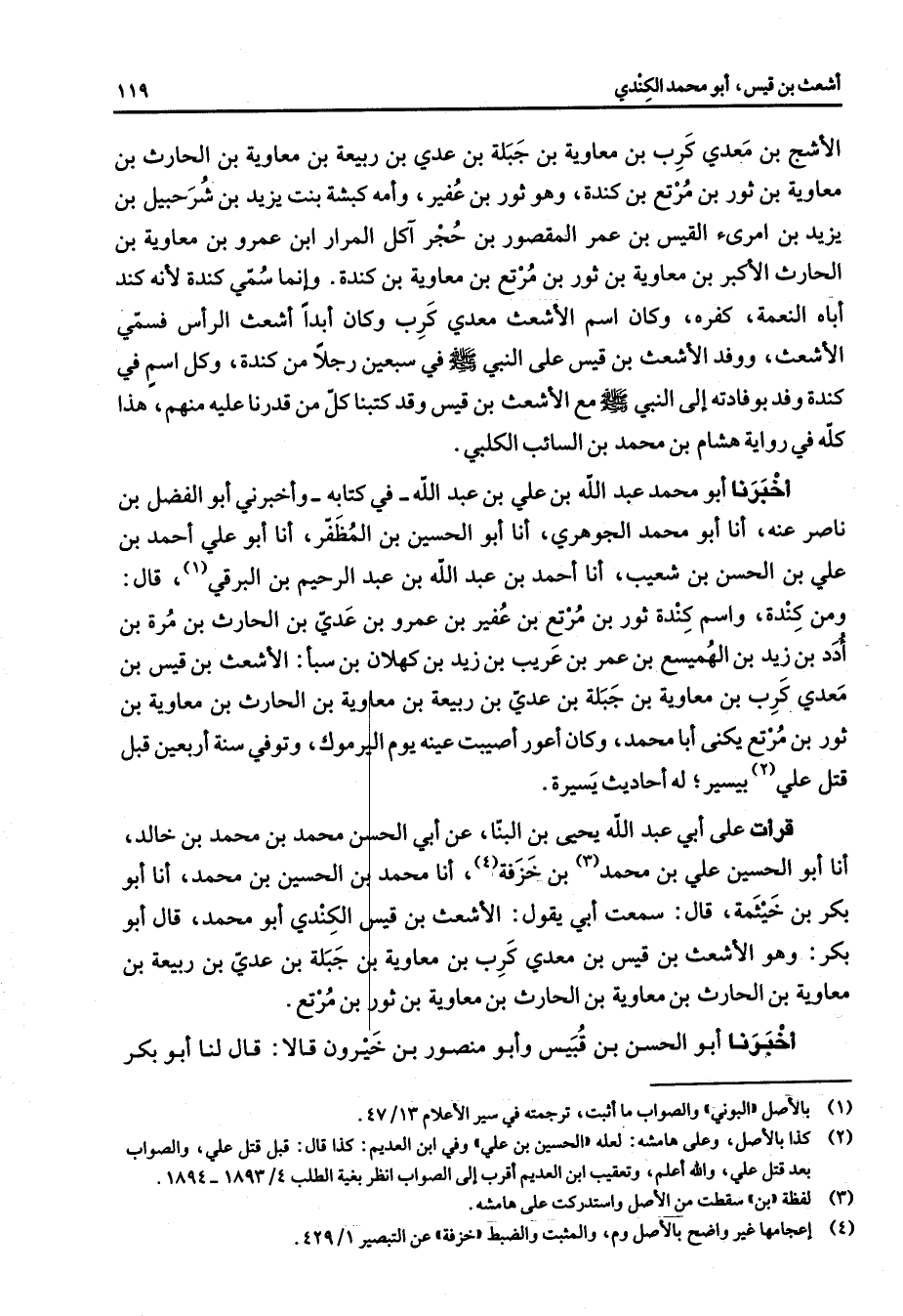 الأشج بن معدي كرب بن معاوية بن جبلة بن عدي بن ربيعة بن معاوية بن الحارث بن معاوية بن ثور بن مرتع بن كندة وهو ثور بن عفير وأمه كبشه بنت يزيد بن شرحبيل بن يزيد بن امرئ القيس بن عمر المقصور بن حجر آكل المرار ابن عمرو بن معاوية بن الحارث الأكبر بن معاوية بن ثور بن مرتع بن معاوية بن كندة وإنما سمي كندة لأنه كند أباه النعمة كفره وكان اسم الأشعث معد كرب وكان أبدا أشعت الرأس فسمي الأشعث ووفد الأشعث بن قيس على النبي (صلى الله عليه وسلم) في سبعين رجلا من كندة وكل اسم في كندة وفد بوفادته إلى النبي (صلى الله عليه وسلم) مع الأشعث بن قيس وقد كتبنا كل من قدرنا عليه منهم هذا كله في رواية هشام بن محمد بن السائب الكلبي أخبرنا أبو محمد عبد الله بن علي بن عبد الله في كتابه وأخبرني أبو الفضل بن ناصر عنه أنا أبو محمد الجوهري أنا أبو الحسين بن المظفر أنا أبو علي أحمد بن علي بن الحسن بن شعيب أنا أحمد بن عبد الله بن عبد الرحيم بن البرقي (1) قال ومن كندة واسم كندة ثور بن مرتع بن عفير بن عمرو بن عدي بن الحارث بن مرة بن أدد بن زيد بن الهميسع بن عمر بن عريب بن زيد بن كهلان بن سبأ الأشعث بن قيس بن معدي كرب بن معاوية بن جبلة بن عدي بن ربيعة بن معاوية بن الحارث بن معاوية بن ثور بن مرتع يكنى أبا محمد وكان أعور أصيبت عينه يوم اليرموك وتوفي سنة أربعين قبل قتل علي (2) بيسير له أحاديث يسيرة قرأت على أبي عبد الله يحيى بن البنا عن أبي الحسن محمد بن محمد بن خالد أنا أبو الحسين علي بن محمد بن (3) خزفة (4) أنا محمد بن الحسين بن محمد أنا أبو بكر خيثمة قال سمعت أبي يقول الأشعث بن قيس الكندي أبو محمد قال أبو بكر وهو الأشعث بن قيس بن معدي كرب بن معاوية بن جبلة بن عدي بن ربيعة بن معاوية بن الحارث بن معاوية بن الحارث بن معاوية بن ثور بن مرتع أخبرنا أبو الحسن بن قبيس وأبو منصور بن خيرون قالا قال لنا أبو بكر