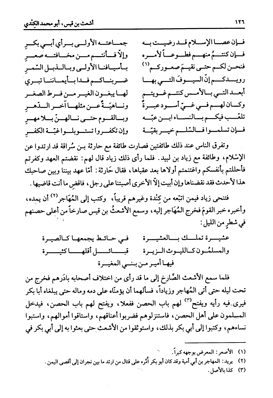 فإن عصا الإسلام قد رضيت به * جماعته الأولى برأي أبي بكر فإن كنتم منهم فطوعا لأمره * وإلا فأنتم من مخافته صعر فنحن لكم حتى نقيم صعوركم (1) * بأسيافنا الأولى وبالذبل السمر رويدكم إن السيوف التي بها * ضربناكم فدا بأيماننا تبري أبعد التي بالأمس كنتم غويتم * لها يبغون الغير من فرط الصغر وكان لهم في غي أسود عبرة * وناهية عن مثلها آخر الدهر تلعب فيكم بالنساء ابن عبه * وبالقوم حتى نالهن بلا مهر فإن تسلموا فالسلم خير بقية * وإن تكفروا تستوبلوا غبة الكفر * وتفرق الناس عند ذلك طائفتين فصارت طائفة مع حارثة بن سراقة قد ارتدوا عن الإسلام وطائفة مع زياد بن لبيد فلما رأى ذلك زياد قال لهم نقضتم العهد وكفرتم فأحللتم بأنفسكم واغتنمتم أولاها بعد عقباها فقال حارثة أما عهد بيننا وبين صاحبك هذا لأحدث فقد نقضناها وإن أبيت إلا الأخرى أصبتنا على رجل فاقض ما أنت قاضيها فتنحى زياد فيمن اتبعه من كندة وغيرهم قريبا وكتب إلى المهاجر (2) أن يمده وأخبره خبر القوم فخرج المهاجر إليه وسمع الأشعث بن قيس صارخا من أعلى حصنهم في شطر من الليل * عشيرة تملك بالعشيرة * في حائط يجمعها كالصيرة والمسلمون كالليوث الزيرة * قبائل أقلها كثيرة فيها أمير من بني المغيرة فلما سمع الأشعث الصارخ إلى ما قد رأى من اختلاف أصحابه بادرهم فخرج من تحت ليله حتى أتى المهاجر وزيادا فسألهما أن يؤمناه على دمه وماله حتى يبلغاه أبا بكر فيرى فيه رأيه ويفتح (3) لهم باب الحصن ففعلا ويفتح لهم باب الحصن فيدخل المسلمون على أهل الحصن فاستنزلوهم فضربوا أعناقهم واستاقوا أموالهم واستبوا نساءهم وكتبوا إلى أبي بكر بذلك واستوثقوا من الأشعث حتى بعثوا به إلى أبي بكر في