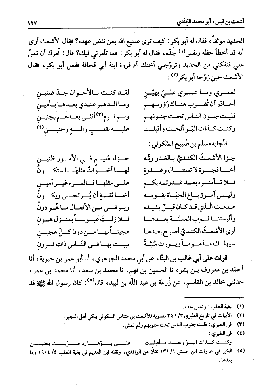 (4) في الطبري: وكنت كذات البور ريعت فأقبلت * على بوها إذ طربت بحنين (5) الخبر في غزوات ابن حنيش 1 / 131 نقلا عن الواقدي ونقله ابن العديم في بغية الطلب 4 / 1904 وما بعدها