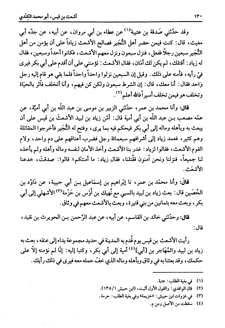 وقد حدثني صدقة بن عتيبة (1) عن عطاء بن أبي مروان عن أبيه عن جده أبي مغيث قال كنت فيمن حضر أهل النجير فصالح الأشعث زيادا على أن يؤمن من أهل النجير سبعين رجلا ففعل فنزل سبعون ونزل معهم الأشعث فكانوا أحدا وسبعين فقال له زياد أقتلك لم يكن لك أمان فقال الأشعث تؤمنني على أن أقدم على أبي بكر فيرى في رأيه فأمنه على ذلك وقيل أن السبعين نزلوا واحدا واحدا فلما بقي هو قام إليه رجل واحد فقال أنا معك قال إن الشرط سبعون ولكن كن فيهم وأنا أتخلف فآثر بالحياة وتخلف هو فيمن تخلف أسيرا فالله أعلم (2) قال وأنا محمد بن عمر حدثني الزبير بن موسى بن عبد الله بن أبي أمية عن عمه مصعب بن عبد الله بن أبي أمية قال أمن زياد بن لبيد الأشعث بن قيس على أن يبعث به وبأهله وماله إلى أبي بكر فيحكم فيه بما يرى وفتح له النجير فأخرجوا المقاتلة وهم كثير فعمد زياد إلى أشرافهم سبعمائة رجل فضرب أعناقهم على دم واحد ولام القوم الأشعث فقالوا لزياد غدر بنا الأشعث وأخذ الأمان لنفسه وماله وأهله ولم يأخذه لنا جميعا فنزلنا ونحن آمنون فقتلنا فقال زياد ما أمنتكم قالوا صدقت خدعنا الأشعث قال وأنا محمد بن عمر نا إبراهيم بن إسماعيل بن أبي حبيبة عن داود بن الحصين قال بعث زياد بن لبيد بالسبي مع نهيك بن أوس بن حزمة (3) الأشهلي إلى أبي بكر وبعث معه بثمانين من بني قتيرة وبعث بالأشعث معهم في وثاق قال وحدثني خالد بن القاسم عن أبيه عن عبد الرحمن بن الحويرث بن نقيد قال رأيت الأشعث بن قيس يوم قدم به المدينة في حديد مجموعة يداه إلى عنقه بعث به زياد بن لبيد والمهاجر بن أبي (4) أمية إلى أبي بكر وكتبا إليه إنا لم نؤمنه إلا على حكمك وقد بعثنا به في وثاق وبأهله وماله الذي خف حمله معه فيرى في ذلك رأيك