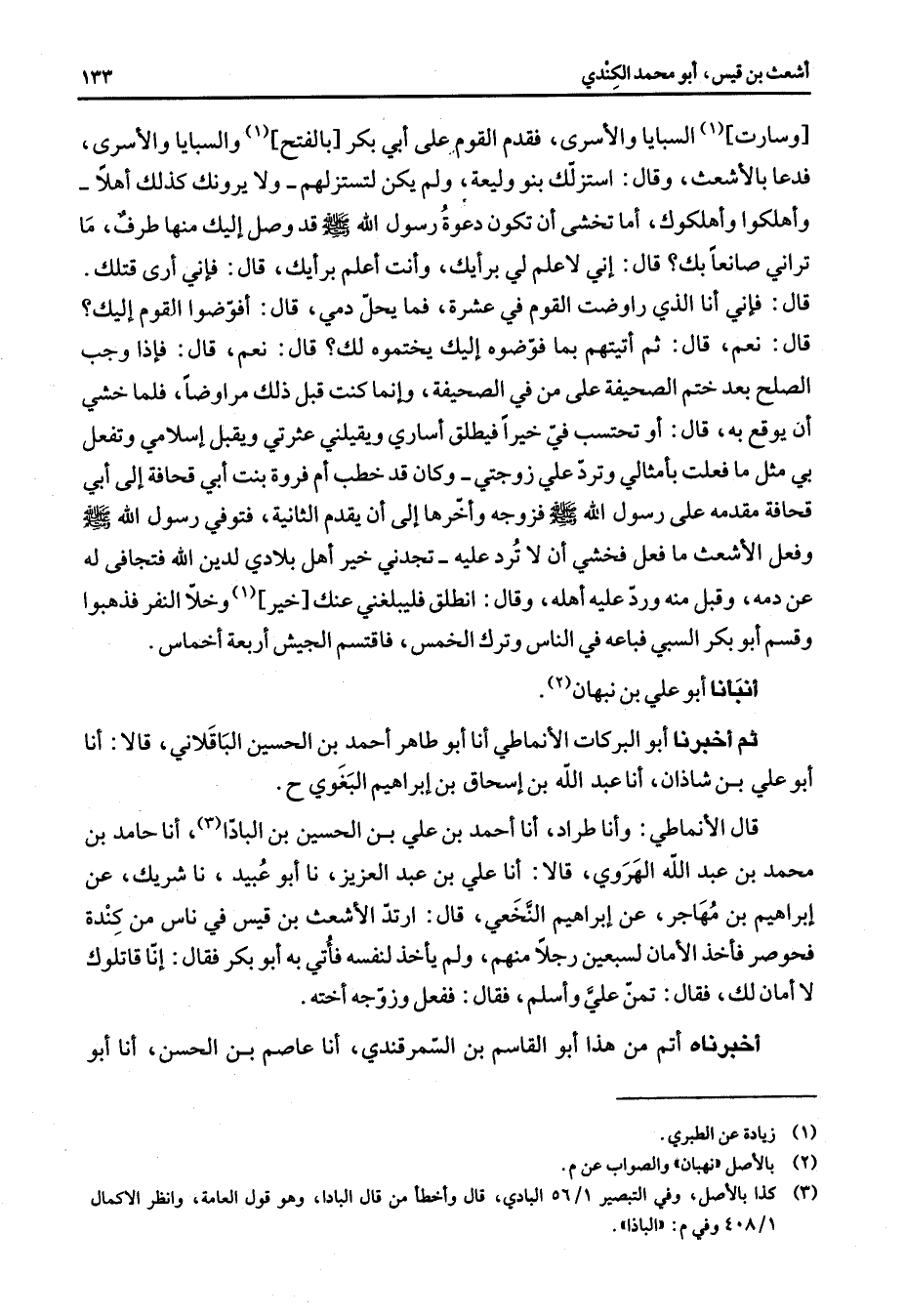 وسارت (1) السبايا والأسرى فقدم القوم على أبي بكر بالفتح (1) والسبايا بالأسرى فدعا بالأشعث وقال استزلك بنو وليعة ولم يكن لتستزلهم ولا يرونك كذلك أهلا وأهلكوا وأهلكوك أما تخشى أن تكون دعوة رسول الله (صلى الله عليه وسلم) وقد وصل إليك منها طرف ما تراني صانعا بك قال إني لا علم لي برأيك وأنت أعلم برأيك قال فإني أرى قتلك قال فإني أنا الذي راوضت القوم في عشرة فما يحل دمي قال أفوضوا القوم إليك قال نعم قال ثم أتيتهم بما فوضوه إليك يختموه لك قال نعم قال فإذا وجب الصلح بعد ختم الصحيفة على من في الصحيفة وإنما كنت قبل ذلك مراوضا فلما خشي أن يوقع به قال أو تحتسب في خيرا فيطلق أساري ويقيلني عثرتي ويقبل إسلامي وتفعل بي مثل ما فعلت بأمثالي وترد علي زوجتي وكان قد خطب أم فروة بنت أبي قحافة إلى أبي قحافة مقدمة على رسول الله (صلى الله عليه وسلم) فزوجه وأخرها إلى أن يقدم الثانية فتوفي رسول الله (صلى الله عليه وسلم) وفعل الشعث ما فعل فخشي أن لا ترد عليه تجدني خير أهل بلادي لدين الله فتجافى له عن دمه وقبل منه ورد عليه أهله وقال انطلق فليبلغني عنك خير (1) وخلا النفر فذهبوا وقسم أبو بكر السبي فباعه في الناس وترك الخمس فاقتسم الجيش أربعة أخماس أنبأنا أبو علي نبهان (2) ثم أخبرنا أبو البركات الأنماطي أنا أبو طاهر أحمد بن الحسين الباقلاني قالا أنا أبو علي بن شاذان أنا عبد الله بن إسحاق بن إبراهيم البغوي قال الأنماطي وأنا طراد أنا أحمد بن علي بن الحسين بن البادا (3) أنا حامد بن محمد بن عبد الله الهروي قالا أنا علي بن عبد العزيز نا أبو عبيد نا شريك عن إبراهيم بن مهاجر عن إبراهيم النخعي قال ارتد الأشعث بن قيس في ناس من كندة فحوصر فأخذ الأمان لسبعين رجلا منهم ولم يأخذ لنفسه فأتي به أبو بكر فقال إنا قاتلوك لا أمان لك فقال تمن علي وأسلم فقال ففعل وزوجه أخته أخبرناه أتم من هذا أبو القاسم بن السمرقندي أنا عاصم بن الحسن أنا أبو