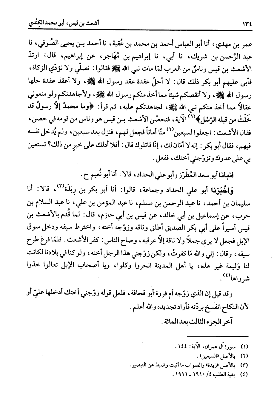عمر بن مهدي أنا أبو العباس أحمد بن محمد بن عقبة نا أحمد بن يحيى الصوفي نا عبد الرحمن بن شريك نا أبي نا إبراهيم بن مهاجر عن إبراهيم قال ارتد الأشعث بن قيس وناس من العرب لما مات نبي الله (صلى الله عليه وسلم) فقالوا نصلي ولا نؤدي الزكاة فأبى عليهم أبو بكر ذلك قال لا أحل عقدة عقد رسول الله (صلى الله عليه وسلم) ولا أعقد عقدة حلها رسول الله (صلى الله عليه وسلم) ولا أنقصكم شيئا مما أخذ منكم رسول الله (صلى الله عليه وسلم) ولأجاهدنكم ولو منعوني عقالا مما أخذ منكم نبي الله (صلى الله عليه وسلم) لجاهدتكم عليه ثم قرأ " وما محمد إلا رسول قد خلت من قبله الرسل " (1) الآية فتحصن الأشعث بن قيس هو وناس من قومه في حصن فقال الأشعث اجعلوا لسبعين (2) منا أمانا فجعل لهم فنزل بعد سبعين ولم يدخل نفسه فيهم فقال أبو بكر إنه لا أمان لك إنا قاتلوك قال أفلا أدلك على خير من ذلك تستعين بي على عدوك وتزوجني أختك ففعل أنبأنا أبو سعيد بن المطرز وأبو علي الحداد قالا أنا أبو نعيم وأخبرنا أبو علي الحداد وجماعة قالوا أنا أبو بكر بن ريذة (3) قالا أنا سليمان بن أحمد نا عبد الرحمن بن مسلم نا عبد المؤمن بن علي نا عبد السلام بن حرب عن إسماعيل بن أبي خالد عن قيس بن أبي حازم قال لما قدم بالأشعث بن قيس أسيرا على أبي بكر الصديق أطلق وثاقه وزوجه أخته واخترط سيفه ودخل سوق الإبل فجعل لا يرى جملا ولا ناقة إلا عرقبه وصاح الناس كفر الأشعث فلما فرغ طرح سيفه وقال إني والله ما كفرت ولكن زوجتي هذا الرجل أخته ولو كنا في بلادنا لكانت لنا وليمة غير هذه يا أهل المدينة نحروا وكلوا ويا أصحاب الإبل تعالوا خذوا شرواها (4) وقد قيل إن الذي زوجه أم فروة أبو قحافة فلعل قوله زوجني أختك أدخلها علي أو لأن النكاح انفسخ بردته فأراد تجديده والله أعلم آخر الجزء الثالث بعد المائة