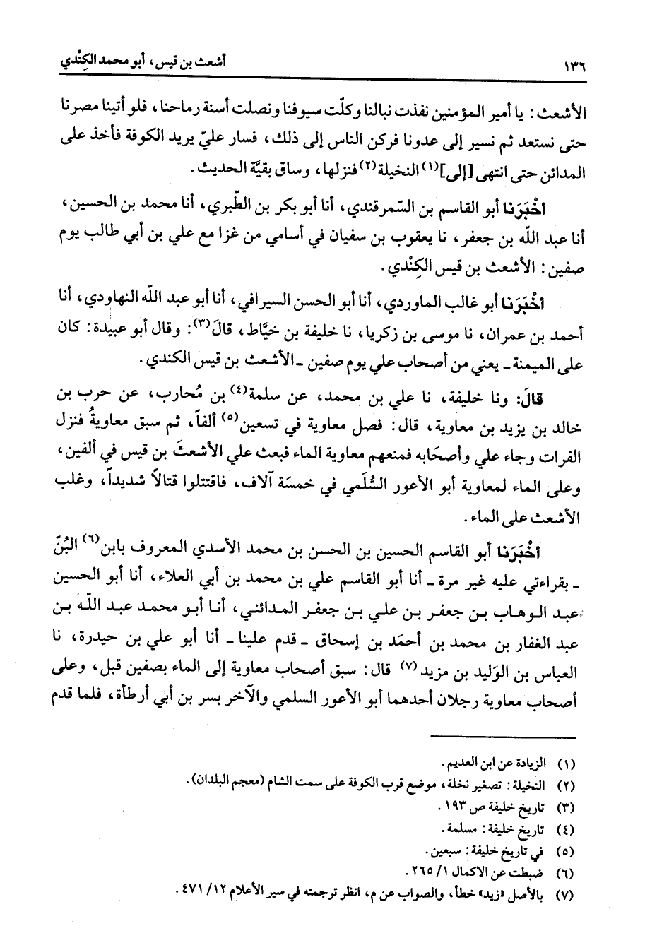 الأشعث يا أمير المؤمنين نفذت نبالنا وكلت سيوفنا ونصلت أسنة رماحنا فلو أتينا مصرنا حتى نستعد ثم نسير إلى عدونا فركن الناس إلى ذلك فسار علي يريد الكوفة فأخذ على المدائن حتى انتهى إلى (1) النخيلة (2) فنزلها وساق بقية الحديث أخبرنا أبو القاسم بن السمرقندي أنا أبو بكر بن الطبري أنا محمد بن الحسين أنا عبد الله بن جعفر نا يعقوب بن سفيان يفي أسامي من غزا مع علي بن أبي طالب يوم صفين الأشعث بن قيس الكندي أخبرنا أبو غالب الماوردي أنا أبو الحسن السيرافي أنا أبو عبد الله النهاودي أنا أحمد بن عمران نا موسى بن زكريا نا خليفة بن خياط قال (3) وقال أبو عبيدة كان على الميمنة يعني من أصحاب علي يوم صفين الأشعث بن قيس الكندي قال ونا خليفة نا علي بن محمد عن سلمة (4) بن محارب عن حرب بن خالد بن يزيد بن معاوية قال فصل معاوية في تسعين (5) ألفا ثم سبق معاوية فنزل الفرات وجاء علي وأصحابه فمنعهم معاوية الماء فبعث علي الأشعث بن قيس في ألفين وعلى الماء لمعاوية أبو الأعور السلمي في خمسة آلاف فاقتتلوا قتالا شديدا وغلب الأشعث على الماء أخبرنا أبو القاسم الحسين بن الحسن بن محمد الأسدي المعروف بابن (6) البن بقراءتي عليه غير مرة أنا أبو القاسم علي بن محمد بن أبي العلاء أنا أبو الحسين عبد الوهاب بن جعفر بن علي بن جعفر المدائني أنا أبو محمد عبد الله بن عبد الغفار بن محمد بن أحمد بن إسحاق قدم علينا أنا أبو علي بن حيدرة نا العباس بن الوليد بن مزيد (7) قال سبق أصحاب معاوية إلى الماء بصفين قبل وعلى أصحاب معاوية رجلان أحدهما أبو الأعور السلمي والآخر بسر بن أبي أرطأة فلما قدم
