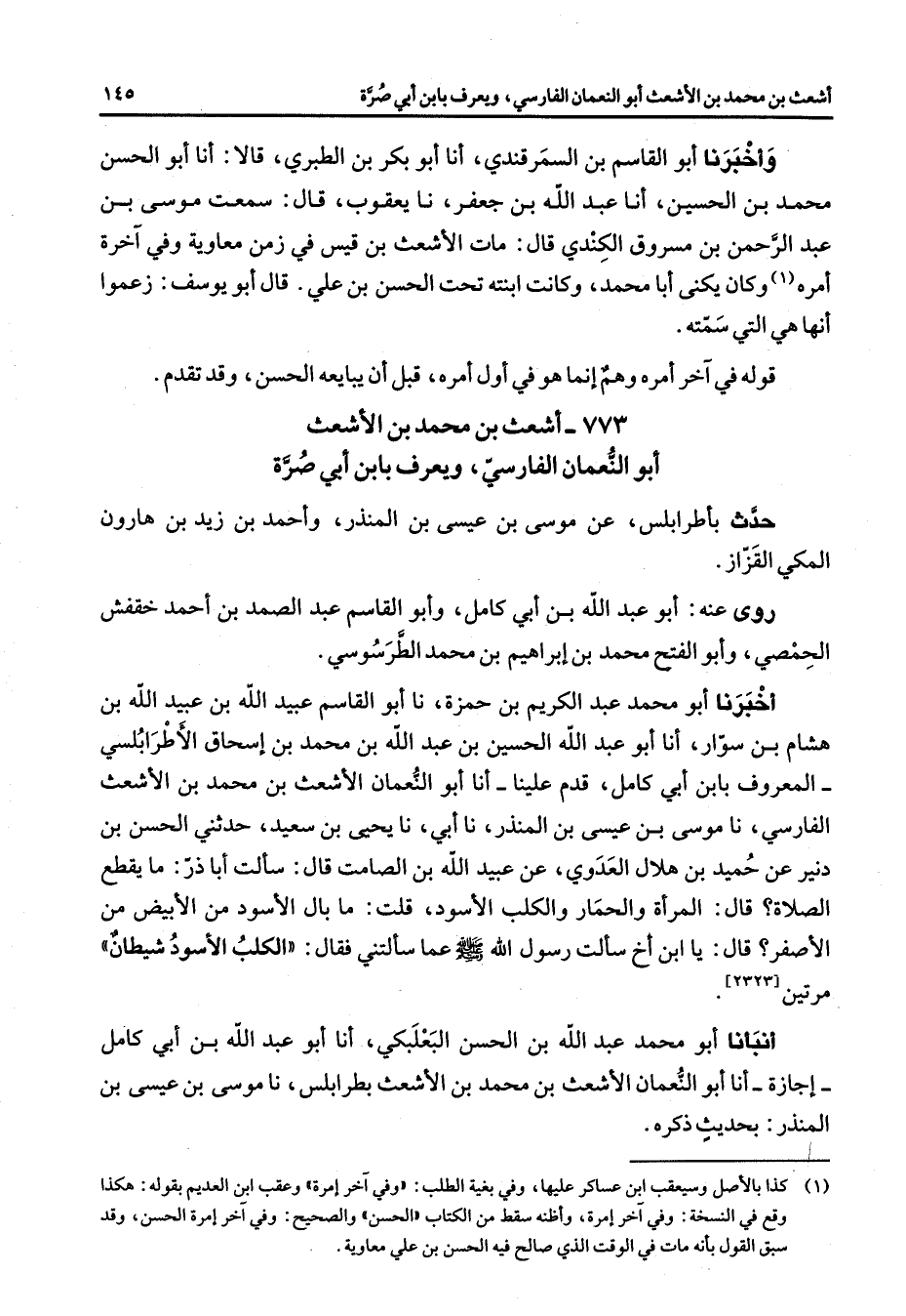 773 - أشعث بن محمد بن الأشعث أبو النعمان الفارسي ويعرف بابن أبي صرة حدث بأطرابلس عن موسى بن عيسى بن المنذر وأحمد بن زيد بن هارون المكي القزاز روى عنه أبو عبد الله بن أبي كامل وأبو القاسم عبد الصمد بن أحمد خقفش الحمصي وأبو الفتح محمد بن إبراهيم بن محمد الطرسوسي أخبرنا أبو محمد عبد الكريم بن حمزة نا أبو القاسم عبيد الله بن عبيد الله بن هشام بن سوار أنا أبو عبد الله الحسين بن عبد الله بن محمد بن إسحاق الأطرابلسي المعروف بابن أبي كامل قدم علينا أنا أبو النعمان الأشعث بن محمد بن الأشعث الفارسي نا موسى بن عيسى بن المنذر نا أبي نا يحيى بن سعيد حدثني الحسن بن دنير عن حميد بن هلال العدوي عن عبيد الله بن الصامت قال سألت أبا ذر ما يقطع الصلاة قال المرأة والحمار والكلب الأسود قلت ما بال السود من الأبيض من الأصفر قال يا ابن أخ سألت رسول الله (صلى الله عليه وسلم) عما سألتني فقال الكلب الأسود شيطان مرتين أنبأنا أبو محمد عبد الله بن الحسن البعلبكي أنا أبو عبد الله بن أبي كامل إجازة أنا أبو النعمان الأشعث بن محمد بن الأشعث بطرابلس نا موسى بن عيسى بن المنذر بحديث ذكره