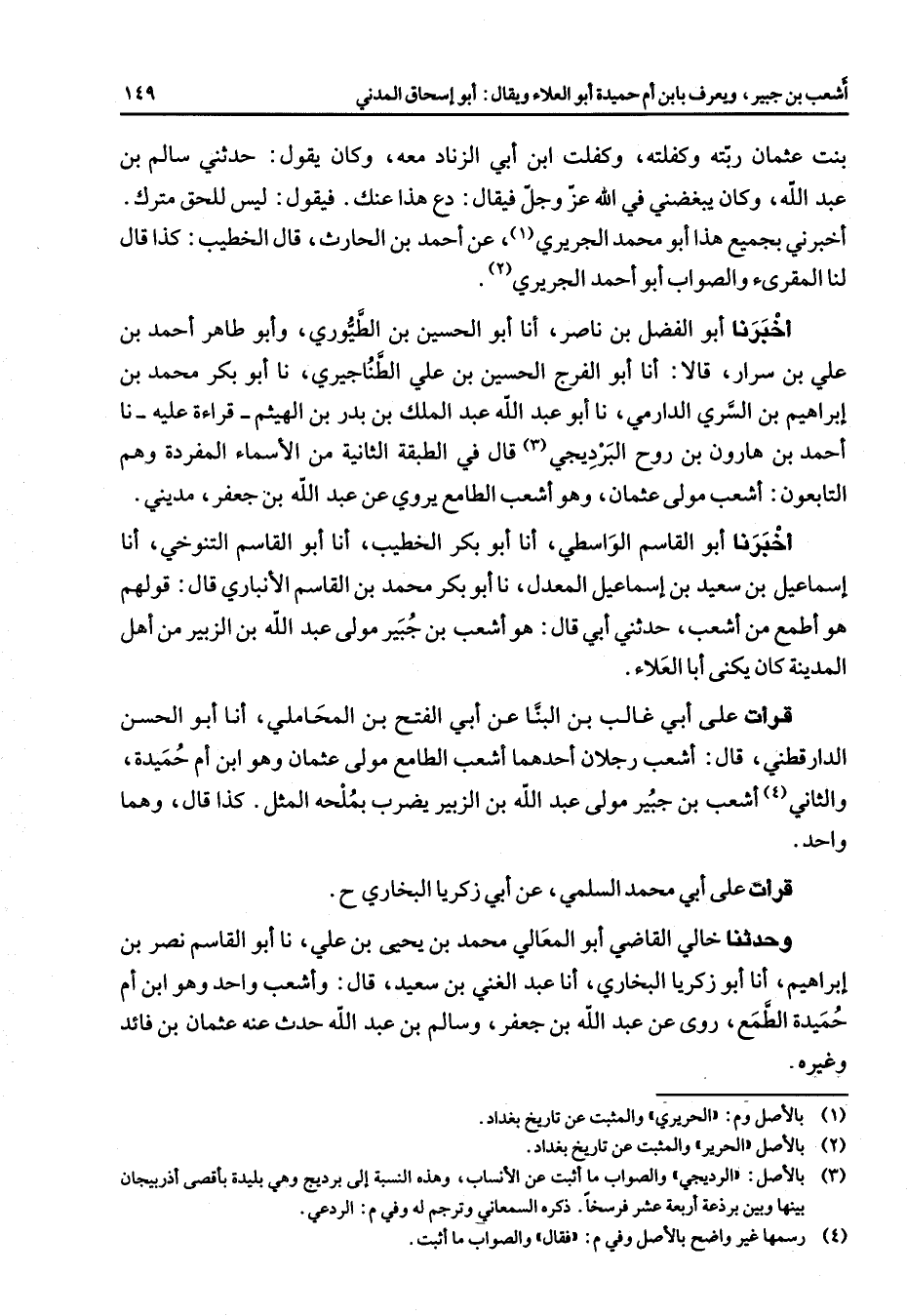 بنت عثمان ربته وكفلته وكفلت ابن أبي الزناد معه وكان يقول حدثني سالم بن عبد الله وكان يبغضني في الله عز وجل فيقال دع هذا عنك فيقول ليس للحق مترك أخبرني بجميع هذا أبو محمد الجريري (1) عن أحمد بن الحارث قال الخطيب كذا قال لنا المقرئ والصواب أبو أحمد الجريري (2) أخبرنا أبو الفضل بن ناصر أنا أبو الحسين بن الطيوري وأبو طاهر أحمد بن علي بن سرار قالا أنا أبو الفرج الحسين بن علي الطناجيري نا أبو بكر محمد بن إبراهيم بن السري الدارمي نا أبو عبد الله عبد الملك بن بدر بن الهيثم قراءة عليه نا أحمد بن هارون بن روح البرديجي (3) قال في الطبقة الثانية من الأسماء المفردة وهم التابعون أشعب مولى عثمان وهو أشعب الطامع يروي عن عبد الله بن جعفر مديني أخبرنا أبو القاسم الواسطي أنا أبو بكر الخطيب أنا أبو القاسم التنوخي أنا إسماعيل بن سعيد بن إسماعيل المعدل نا أبو بكر محمد بن القاسم الأنباري قال قولهم هو أطمع من أشعب حدثني أبي قال هو أشعب بن جبير مولى عبد الله بن الزبير من أهل المدينة كان يكنى أبا العلاء قرأت على أبي غالب بن البنا عن أبي الفتح بن المحاملي أنا أبو الحسن الدارقطني قال أشعب رجلان أحدهما أشعب الطامع مولى عثمان وهو ابن أم حميدة والثاني (4) أشعب بن جبير مولى عبد الله بن الزبير يضرب بملحه المثل كذا قال وهما واحد قرأت على أبي محمد السلمي عن أبي زكريا البخاري وحدثنا خالي القاضي أبو المعالي محمد بن يحيى بن علي نا أبو القاسم نصر بن إبراهيم أنا أبو زكريا البخاري أنا عبد الغني بن سعيد قال وأشعب واحد وهو ابن أم حميدة الطمع روى عن عبد الله بن جعفر وسالم بن عبد الله حدث عنه عثمان بن فائد وغيره