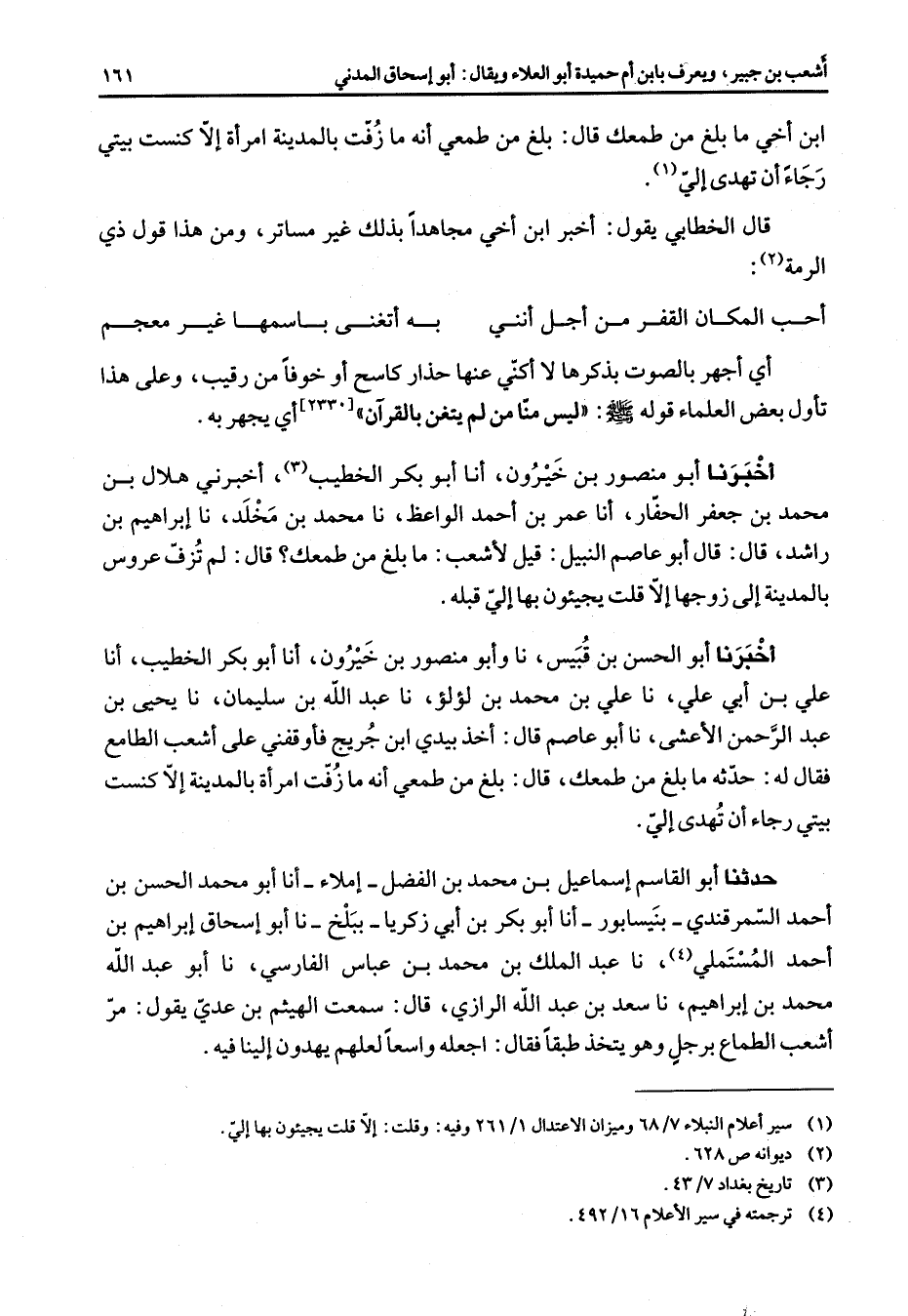 ابن أخي ما بلغ من طمعك قال بلغ من طمعي أنه ما زفت بالمدينة امرأة إلا كنست بيتي رجاء أن تهدي إلي (1) قال الخطابي يقول أخبر ابن أخي مجاهدا بذلك غير مساتر ومن هذا قول ذي الرمة (2) * أحب المكان القفر من أجل أنني * به أتغنى باسمها غير معجم * أي اجهر بالصوت بذكرها لا أكني عنها حذار كاسح أو خوفا من رقيب وعلى هذا تأول بعض العلماء قوله (صلى الله عليه وسلم) ليس منا من لم يتغن بالقرآن أي يجهر به أخبرنا أبو منصور بن خيرون أنا أبو بكر الخطيب (3) أخبرني هلال بن محمد بن جعفر الحفار أنا عمر بن أحمد الواعظ نا محمد بن مخلد نا إبراهيم بن راشد قال قال أبو عاصم النبيل قيل لأشعب ما بلغ من طمعك قال لم تزف عروس بالمدينة إلى زوجها إلا قلت يجيئون بها إلي قبله أخبرنا أبو الحسن بن قبيس نا وأبو منصور بن خيرون أنا أبو بكر الخطيب أنا علي بن أبي علي نا علي بن محمد بن لؤلؤ نا عبد الله بن سليمان نا يحيى بن عبد الرحمن الأعشى نا أبو عاصم قال أخذ بيدي ابن جريج فأوقفني على أشعب الطامع فقال له حدثه ما بلغ من طمعك قال بلغ من طمعي أنه ما زفت امرأة بالمدينة إلا كنست بيتي رجاء أن تهدى إلي حدثنا أبو القاسم إسماعيل بن محمد بن الفضل إملاء أنا أبو محمد الحسن بن أحمد السمرقندي بنيسابور أنا أبو بكر بن أبي زكريا ببلخ نا أبو إسحاق إبراهيم بن أحمد المستملي (4) نا عبد الملك بن محمد بن عباس الفارسي نا أبو عبد الله محمد بن إبراهيم نا سعد بن عبد الله الرازي قال سمعت الهيثم بن عدي يقول مر أشعب الطماع برجل وهو يتخذ طبقا فقال اجعله واسعا لعلهم يهدون إلينا فيه