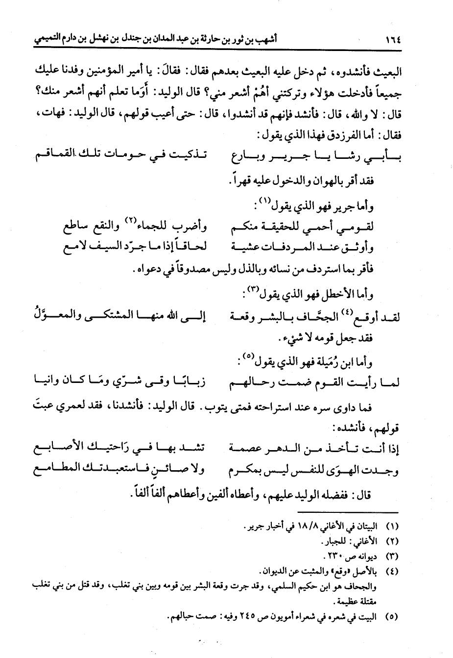 (1) * لقومي أحمي للحقيقة منكم * واضرب للجماء (2) والنقع ساطع وأوثق عند المردفات عشية * لحاقا إذا ما جرد السيف لامع * فأقر بما استردف من نسائه وبالذل وليس مصدوقا في دعواه (3) وأما الأخطل فهو الذي يقول * لقد أو قع (4) الجحاف بالبشر وقعة * إلى الله منها المشتكى والمعول * فقد جعل قومه لا شئ وأما ابن رميلة فهو الذي يقول (5) * لما رأيت القوم ضمت رحالهم * زبابا وقى شري وما كان وانيا * فما داوى سره عند استراحته فمتى يتوب قال الوليد فأنشدنا فقد لعمري عبت قولهم فأنشده * إذا أنت تأخذ من الدهر عصمة * تشد بها في راحتيك الأصابع وجدت الهوى للنفس ليس بمكرم * ولا صائن فاستبعدتك المطامع * قال ففضله الوليد عليهم وأعطاه ألفين وأعطاهم ألفا ألفا *