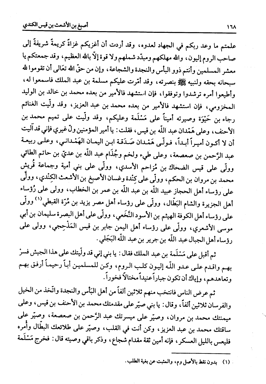 علمتم ما وعد ربكم في الجهاد لعدوه وقد أردت أن أغزيكم غزاة كريمة شريفة إلى صاحب الروم إليون والله مهلكهم ومبدد شملهم ولا قوة إلا بالله العظيم وقد جمعتكم يا معشر المسلمين وأنتم ذوو البأس والنجدة والشجاعة وإن من حق الله تعالى أن تقوموا لله سبحانه بحقه ولنبيه (صلى الله عليه وسلم) بنصرته وقد أمرت عليكم مسلمة بن عبد الملك فاسمعوا له وأطيعوا أمره ترشدوا وتوفقوا فإن استشهد فالأمير من بعده محمد بن خالد بن الوليد المخزومي فإن استشهد فالأمير من بعده محمد بن عبد العزيز وقد وليت الغنائم رجاء بن حيوة وصيرته أمينا على مسلمة وعليكم وقد وليت على تميم محمد بن الأحنف وعلى همدان عبد الله بن قيس فقلت يا أمير المؤمنين ول غيري فإني قد آليت أن لا أكون أميرا أبدا فولى همدان صدقة ابن اليمان الهمداني وعلى ربيعة عبد الرحمن بن صعصعة وعلى طئ ولخم زجذام عبد الله بن عدي بن حاتم الطائي وولى على قيس الضحاك بن مزاحم الأسدي وولى على بني أمية وجماعة قريش محمد بن مروان بن الحكم وولى على كندة وغسان الأصبغ بن الأشعث الكندي وولى على رؤساء أهل الحجاز عبيد الله بن عبد الله بن عمر بن الخطاب وولى على رؤساء أهل الجزيرة والشام البطال وولى على رؤساء أهل مصر يزيد بن مرة القبطي (1) وولى على رؤساء أهل الكوفة الهيثم بن الأسود النخعي وولى على أهل البصرة سليمان بن أبي موسى الأشعري وولى على رؤساء أهل اليمن جابر بن قيس المذحجي وولى على رؤساء أهل الجبال عبد الله بن جرير بن عبد الله البجلي ثم أقبل على مسلمة بن عبد الملك فقال يا بني إني قد وليتك على هذا الجيش فسر بهم وأقدم على عدو الله إليون كلب الروم وكن للمسلمين أبا رحيما أرفق بهم وتعاهدهم وأياك أن تكون جبارا عنيدا مختالا فخورا ثم عرض الناس فانتخب منهم ثلاثين ألفا من أهل البأس والنجدة واتخذ من الخيل والفرسان ثلاثين ألفا وقال يا بني صير على مقدمتك محمد بن الأحنف بن قيس وعلى ميمنتك محمد بن مروان وصير على ميسرتك عبد الرحمن بن صعصعة وصير على ساقتك محمد بن عبد العزيز وكن أنت في القلب وصير على طلائعك البطال وأمره فليعس بالليل العسكر فإنه أمين ثقة مقدام شجاع وذكر باقي وصيته قال فخرج مسلمة
