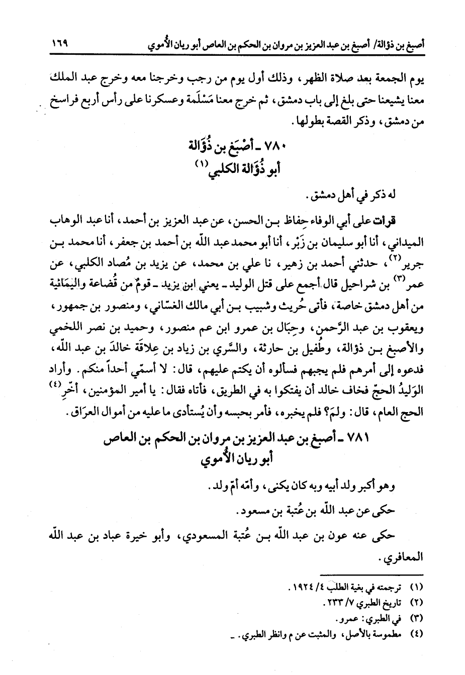 780 - أصبغ بن ذؤالة أبو ذؤالة الكلبي (1) له ذكر في أهل دمشق قرأت على أبي الوفاء حفاظ بن الحسن عن عبد العزيز بن أحمد أنا عبد الوهاب الميداني أنا أبو سليمان بن زبر أنا أبو محمد عبد الله بن أحمد بن جعفر أنا محمد بن جرير (2) حدثني أحمد بن زهير نا علي بن محمد عن يزيد بن مصاد الكلبي عن عمر (3) بن شراحيل قال أجمع على قتل الوليد يعني ابن يزيد قوم من قضاعة واليمانية من أهل دمشق خاصة فأتى حريث وشبيب بن أبي مالك الغساني ومنصور بن جمهور ويعقوب بن عبد الرحمن وحبال بن عمرو ابن عم منصور وحميد بن نصر اللخمي والأصبغ بن ذؤالة وطفيل بن حارثة والسري بن زياد بن علاقة خالد بن عبد الله فدعوهم إلى أمرهم فلم يجبهم فسألوه أن يكتم عليهم قال لا أسمي أحدا منكم وأراد الوليد الحج فخاف خالد أن يفتكوا به في الطريق فأتاه فقال يا أمير المؤمنين أخر (4) الحج العام قال ولم فلم يخبره فأمر بحبسه وأن يستأدى ما عليه من أموال العراق
