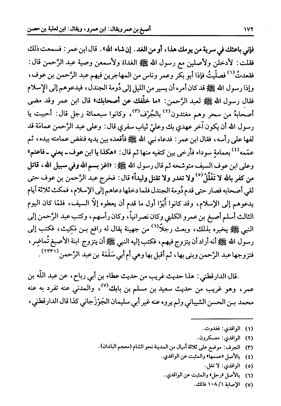 فإني باعثك في سرية من يومك هذا أو من الغد إن شاء الله قال ابن عمر فسمعت ذلك فقلت لأدخلن ولأصلين مع رسول الله (صلى الله عليه وسلم) الغداة ولأسمعن وصية عبد الرحمن قال فقعدت (1) فصليت فإذا أبو بكر وعمر وناس من المهاجرين فيهم عبد الرحمن بن عوف وإذا رسول الله (صلى الله عليه وسلم) قد كان أمره أن يسير من الليل إلى دومة الجندل فيدعوهم إلى الإسلام فقال رسول الله (صلى الله عليه وسلم) لعبد الرحمن ما خلفك عن أصحابك قال ابن عمر وقد مضى أصحابه من سحر وهم مغتدون (2) بالجرف (3) وكانوا سبعمائة رجل قال أحببت يا رسول الله أن يكون آخر عهدي بك وعلي ثياب سفري قال وعلى عبد الرحمن عمامة قد لفها على رأسه فقال ابن عمر فدعاه نبي الله (صلى الله عليه وسلم) فأقعده بين يديه فنفض عمامته بيده ثم عممه (4) بعمامة سوداء فأرخى بين كتفيه منها ثم قال هكذا يا ابن عوف يعني فاعتم وعلى ابن عوف السيف متوشحه ثم قال رسول الله (صلى الله عليه وسلم) أغز بسم الله وفي سبيل الله قاتل من كفر بالله لا تغلل (5) ولا تغدر ولا تقتل وليدا قال فخرج عبد الرحمن بن عوف حتى لقي أصحابه فصار حتى قدم دومة الجندل فلما دخلها دعاهم إلى الإسلام فمكث ثلاثة أيام يدعوهم إلى الإسلام وقد كانوا أبوا أول ما قدم أن يعطوه إلا السيف فلما كان اليوم الثالث أسلم أصبغ بن عمرو الكلبي وكان نصرانيا وكان رأسهم وكتب عبد الرحمن إلى النبي (صلى الله عليه وسلم) يخبره بذلك وبعث رجلا (6) من جهينة يقال له رافع بن مكيث فكنب إلى رسول الله (صلى الله عليه وسلم) أنه أراد أن يتزوج فيهم فكتب إليه النبي (صلى الله عليه وسلم) أن يتزوج ابنة الأصبغ تماضر فتزوجها عبد الرحمن وبنى بها ثم أقبل بها وهي أم أبي سلمة بن عبد الرحمن قال الدارقطني هذا حديث غريب من حديث عطاء بن أبي رباح عن عبد الله بن عمر وهو غريب من حديث سعيد بن مسلم بن بابك (7) والمدني عنه تفرد به عنه محمد بن الحسن الشيباني ولم يروه عنه غير أبي سليمان الجوزجاني كذا قال الدارقطني