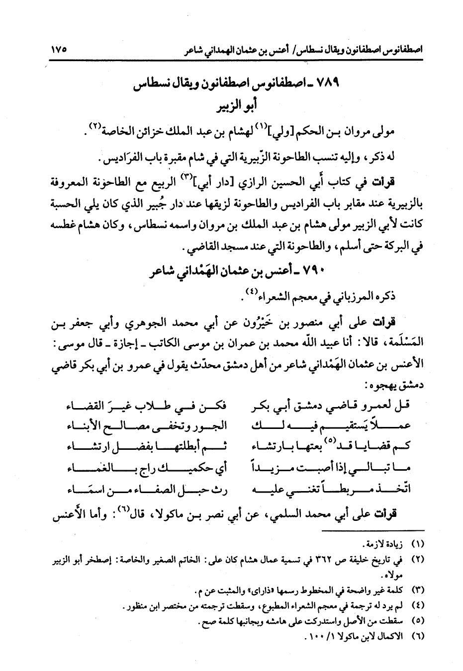 790 - أعنس بن عثمان الهمداني شاعر ذكره المرزباني في معجم الشعراء (4) قرأت على أبي منصور بن خيرون عن أبي محمد الجوهري وأبي جعفر بن المسلمة قالا أنا عبيد الله محمد بن عمران بن موسى الكاتب إجازة قال موسى الأعنس بن عثمان الهمداني شاعر من أهل دمشق محدث يقول في عمرو بن أبي بكر قاضي دمشق يهجوه * قل لعمرو قاضي دمشق أبي بكر * فكن في طلاب غير القضاء عملا يستقيم فيه لك * الجور وتخفى مصالح الأبناء كم قضايا قد (5) بعتها بارتشاء * ثم أبطلتها بفضل ارتشاء * * ما تبالي إذا أصبت مزيدا * أي حكميك راج بالغماء اتخذ مربطا تغني عليه * رث حبل الصفاء من أسماء * قرأت على أبي محمد السلمي عن أبي نصر بن ماكولا قال (6) وأما الأعنس