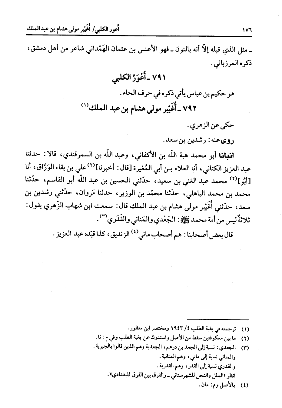 792 - أغيبر مولى هشام بن عبد الملك (1) حكى عن الزهري روى عنه رشدين بن سعد أنبأنا أبو محمد هبة الله بن الأكفاني وعبد الله بن السمرقندي قالا حدثنا عبد العزيز الكتاني أنا العلاء بن أبي المغيرة قال أخبرنا (2) علي بن بقاء الوراق أنا أبو (2) محمد عبد الغني بن سعيد حدثني الحسين بن عبد الله أبو القاسم حدثنا محمد بن محمد الباهلي حدثنا محمد بن الوزير حدثنا مروان حدثني رشدين بن سعد حدثني أغيبر مولى هشام بن عبد الملك قال سمعت ابن شهاب الزهري يقول ثلاثة ليس من أمة محمد (صلى الله عليه وسلم) الجعدي والمناني والقدري (3) قال بعض أصحابنا هم أصحاب ماني الزنديق كذا قيده عبد العزيز "