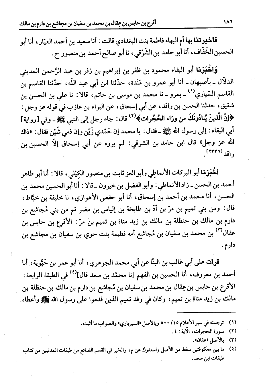 فأخبرتنا بها أم البهاء فاطمة بنت البغدادي قالت أنا سعيد بن أحمد العيار أنا أبو الحسين الخفاف أنا أبو حامد بن الشرقي نا أبو صالح أحمد بن منصور ح وأخبرنا أبو البقاء محمود بن ظفر بن إبراهيم بن زفر بن عبد الرحمن المديني الدلال بأصبهان أنا أبو عمرو بن مندة حدثنا ابن أبي عبد الله حدثنا القاسم بن القاسم السياري (1) بمرو نا محمد بن موسى بن حاتم قالا نا علي بن الحسن بن شقيق حدثنا الحسن بن واقد عن أبي إسحاق عن البراء بن عازب في قوله عز وجل " إن الذين ينادونك من وراء الحجرات " (2) قال جاء رجل إلى النبي (صلى الله عليه وسلم) وفي رواية أبي البقاء إلى رسول الله (صلى الله عليه وسلم) فقال يا محمد إن حمدي زين وإن ذمي شين فقال ذاك الله عز وجل قال ابن حامد بن الشرقلم يروه عن أبي إسحاق إلا الحسين بن واقد أخبرنا أبو البركات الأنماطي وأبو العز ثابت بن منصور الكيلي قالا أنا أبو طاهر أحمد بن الحسن زاد الأنماطي وأبو الفضل بن خيرون قالا أنا أبو الحسين محمد بن الحسن أنا محمد بن أحمد بن إسحاق أنا أبو حفص الأهوازي نا خليفة بن خياط قال ومن بني تميم بن مر بن أد بن طابخة بن إلياس بن مضر ثم من بني مجاشع بن دارم بن مالك بن حنظلة بن مالك بن زيد مناة بن تميم بن مر الأقرع بن حابس بن عقال (3) بن محمد بن سفيان بن مجاشع أمه فطيمة بنت حوي بن سفيان بن مجاشع بن دارم قرأت على أبي غالب بن البنا عن أبي محمد الجوهري أنا أبو عمر بن حيوية أنا أحمد بن معروف أنا الحسين بن الفهم نا محمد بن سعد قال (4) في الطبقة الرابعة الأقرع بن حابس بن عقال بن محمد بن سفيان بن مجاشع بن دارم بن مالك بن حنظلة بن مالك بن زيد مناة بن تميم وكان في وفد تميم الذين قدموا على رسول الله (صلى الله عليه وسلم) وأعطاه