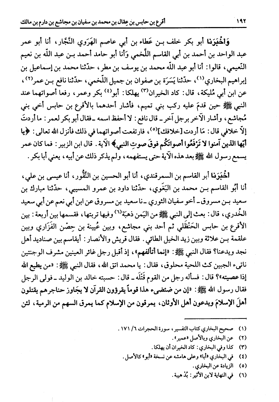 وأخبرنا أبو بكر خلف بن طاء بن أبي عاصم الهروي النجار أنا أبو عمر عبد الواحد بن أحمد بن أبي القاسم اللخمي وأنا أبو حامد أحمد بن عبد الله بن نعيم النعيمي قالوا أنا أبو عبد الله محمد بن يوسف بن مطر حدثنا محمد بن إسماعيل بن إبراهيم البخاري (1) حدثنا يسرة بن صفوان بن جميل اللخمي حدثنا نافع بن عمر (2) عن ابن أبي مليكة قال كاد الخيران (3) يهلكا أبو (4) بكر وعمر رفعا أصواتهما عند النبي (صلى الله عليه وسلم) حين قدم عليه ركب بني تميم فأشار أحدهما بالأقرع بن حابس أخي بني مجاشع وأشار الآخر برجل آخر قال نافع لا أحفظ اسمه فقال أبو بكر لعمر ما أردت إلا خلافي قال ما أردت خلافك (5) فارتفعت أصواتهما في ذلك فأنزل الله تعالى " يا أيها الذين آمنوا لا ترفعوا أصواتكم فوق صوت النبي " الآية قال ابن الزبير فما كان عمر يسمع رسول الله (صلى الله عليه وسلم) بعد هذه الآية حتى يستفهمه ولم يذكر ذلك عن أبيه يعني أبا بكر أخبرنا أبو القاسم بن السمرقندي أنا أبو الحسين بن النقور أنا عيسى بن علي أنا أبو القاسم بن محمد بن البغوي حدثنا داود بن عمرو المسيبي حدثنا مبارك بن سعيد بن مسروق أخو سفيان الثوري نا سعيد بن مسروق عن ابن أبي نعم عن أبي سعيد الخدري قال بعث إلى النبي (صلى الله عليه وسلم) من اليمن ذهبة (6) وفيها تربتها فقسمها بين أربعة بين الأقرع بن حابس الحنظلي ثم احد بني مجاشع وبين عيينة بن حصن الفزاري وبين علقمة بن علاثة وبين زيد الخيل الطائي فقال قريش والأنصار أيقاسم بني صناديد أهل نجد ويدعنا فقال النبي (صلى الله عليه وسلم) إنما أتألفهم إذ أقبل رجل غائر العينين مشرف الوجنتين ناتئ الجبين كث اللحية محلوق فقال يا محمد اتق الله فقال النبي (صلى الله عليه وسلم) من يطيع الله إذا عصيته قال فسأله رجل من القوم قتله قال حسبته خالد بن الوليد فولى الرجل فقال رسول الله (صلى الله عليه وسلم) إن ضئضئ هذا قوما يقرؤون القرآن لا يجاوز حناجرهم يقتلون أهل الإسلام ويدعون أهل الأوثان يمرقون من الإسلام كما يمرق السهم من الرمية لئن
