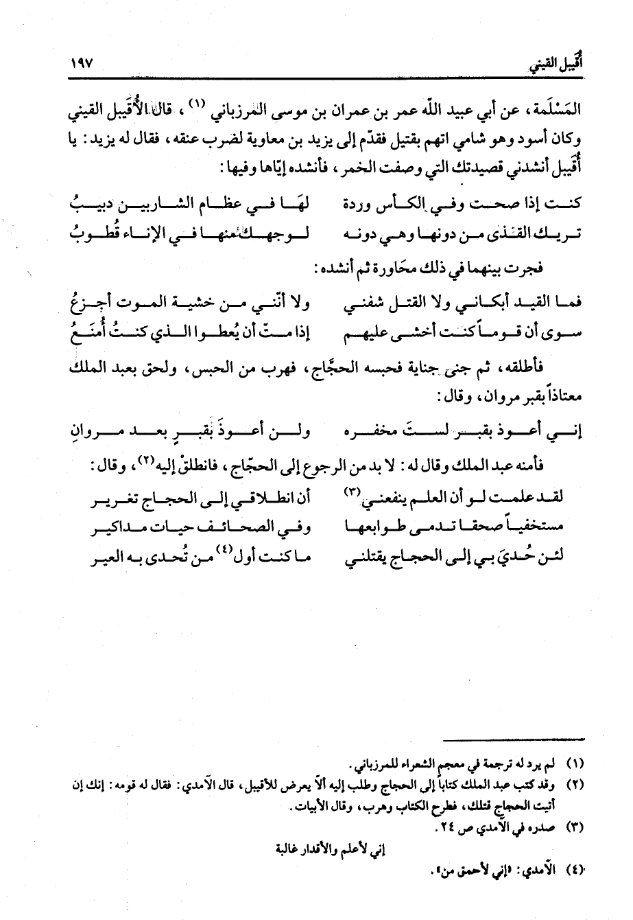المسلمة عن أبي عبيد الله عمر بن عمران بن موسى المرزباني (1) قال الأقيبل القيني وكان أسود وهو شامي أتهم بقتيل فقدم إلى يزيد بن معاوية لضرب عنقه فقال له يزيد يا أقيبل أنشدني قصيدتك التي وصفت الخمر فأنشده إياها وفيها * كنت إذا صحت وفي الكأس وردة * لها في عظام الشاربين دبيب تريك القذى من دونها وهي دونه * لوجهك منها في الإناء قطوب * فجرت بينهما في ذلك محاورة ثم أنشده * فما القيد أبكاني ولا القتل شفني * ولا أنني من خشية الموت أجزع سوى أن قوما كنت أخشى عليهم * إذا مت أن يعطوا الذي كنت أمنع * فأطلقه ثم جنى جناية فحبسه الحجاج فهرب من الحبس ولحق بعبد الملك معتاذا بقبر مروان وقال * إني أعوذ بقبر لست مخفره * ولن أعوذ بقبر بعد مروان * فأمنه عبد الملك وقال له لابد من الرجوع إلى الحجاج فانطلق إليه (2) وقال * لقد علمت لو أن العلم ينفعني * (3) أن انطلاقي إلى الحجاج تغرير مستخفيا صحقا تدمى طوابعها * وفي الصحائف حيات مداكير لئن حدي بي إلى الحجاج يقتلني * ما كنت أول (4) من تحدى به العير *