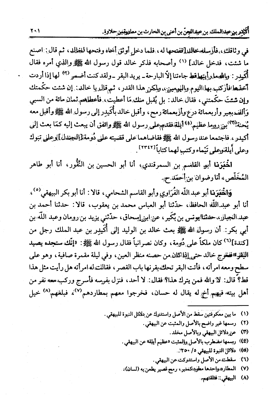 في وثاقك فأرسله خالد ففتحها له فلما دخل أوثق أخاه وفتحها لخالد ثم قال اصنع ما شئت فدخل خالد (1) وأصحابه فذكر خالد قول رسول الله (صلى الله عليه وسلم) والذي أمر فقال أكيدر والله ما رأيتها قط جاءتنا إلا البارحة يريد البقر ولقد كنت أضمر (2) لها إذا أردت أخذها فأركب بها اليوم واليومين ولكن هذا القدر ثم قال يا خالد إن شئت حكمتك وإن شئت حكمتني فقال خالد بل يقبل منك ما أعطيت فأعطاهم ثمان مائة من السبي وألف بعير وأربعمائة درع وأربعمائة رمح وأقبل خالد بأكيدر إلى رسول الله (صلى الله عليه وسلم) وأقبل معه يحنة (3) بن روما عظيم (4) أيلة فقدم على رسول الله (صلى الله عليه وسلم) واتفق أن يبعث إليه كما بعث إلى أكيدر فاجتمعا عند رسول الله (صلى الله عليه وسلم) فقاضاهما على قضيته على دومة الجندل وعلى تبوك وعلى أيلة وعلى تيماء وكتب لهما كتابا أخبرنا أبو القاسم بن السمرقندي أنا أبو الحسين بن النقور أنا أبو طاهر المخلص أنا رضوان بن أحمد وأخبرنا أبو عبد الله الفراوي وأبو القاسم الشحامي قالا أنا أبو بكر البيهقي (5) أنا أبو عبد الله الحافظ حدثنا أبو العباس محمد بن يعقوب قالا حدثنا أحمد بن عبد الجبار حدثنا يونس بن بكير عن ابن إسحاق حدثني يزيد بن رومان وعبد الله بن أبي بكر أن رسول الله (صلى الله عليه وسلم) بعث خالد بن الوليد إلى أكيدر بن عبد الملك رجل من كندة (6) كان ملكا على دومة وكان نصرانيا فقال رسول الله (صلى الله عليه وسلم) إنك ستجده يصيد البقر فخرج خالد حتى إذا كان من حصنه منظر العين وفي ليلة مقمرة صافية وهو على سطح ومعه امرأته فأتت البقر تحك بقرنها باب القصر فقالت له امرأته هل رأيت مثل هذا قط قال لا والله فمن يترك هذا فقال لا أحد فنزل بفرسه فأسرج وركب معه نفر من أهل بيته فيهم أخ له يقال له حسان فخرجوا معهم بمطاردهم (7) فبلغهم (8) خيل
