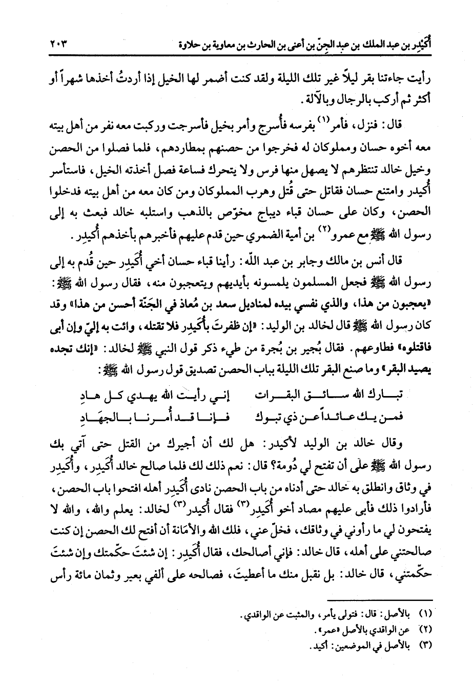 رأيت جاءتنا بقر ليلا غير تلك اليله ولقد كنت أضمر لها الخيل إذا أردت أخذها شهرا أو أكثر ثم أركب بالرجال وبالآلة قال فنزل فأمر (1) بفرسه فأسرج وأمر بخيل فأسرجت وركبت معه نفر من أهل بيته معه أخوه حسان ومملوكان له فخرجوا من حصنهم بمطاردهم فلما فصلوا من الحصن وخيل خالد نتظرهم لا يصهل منها فرس ولا يتحرك فساعة فصل أخذته الخيل فاستأسر أكيدر وامتنع حسان فقاتل حتى قتل وهرب المملوكان ومن كان معه من أهل بيته فدخلوا الحصن وكان على حسان قباء ديباج مخوص بالذهب واستلبه خالد فبعث به إلى رسول الله (صلى الله عليه وسلم) مع عمرو بن أمية الضمري حين قدم عليهم فأخبرهم بأخذهم أكيدر (2) قال أنس بن مالك وجابر بن عبد الله رأينا قباء حسان أخي كيدر حين قدم به إلى رسول الله (صلى الله عليه وسلم) فجعل المسلمون يلمسونه بأيديهم ويتعجبون منه فقال رسول الله (صلى الله عليه وسلم) يعجبون من هذا والذي نفسي بيده لمناديل سعد بن معاذ في الجنة أحسن من هذا وقد كان رسول الله (صلى الله عليه وسلم) قال لخالد بن الوليد إن ظفرت بأكيدر فلا تقتله وأئت به إلي وإن أبى فاقتلوه فطاوعهم فقال فجير بن بجرة من طئ ذكر قول النبي (صلى الله عليه وسلم) لخالد إنك تجده يصيد البقر وما صنع البقر تلك الليلة بباب الحصن تصديق قول رسول الله (صلى الله عليه وسلم) * تبارك الله سائق البقرات * إني رأيت الله يهدي كل هاد فمن يك عائدا عن ذي تبوك * فإنا قد أمرنا بالجهاد * وقال خالد بن الوليد لأكيدر هل لك أن أجيرك من القتل حتى آتي بك رسول الله (صلى الله عليه وسلم) على أن تفتح لي دومة قال نعم ذلك لك فلما صالح خالد أكيدر وأكيدر في وثاق وانطلق به خالد حتى أدناه من باب الحصن نادى أكيدر أهله افتحوا باب الحصن فأرادوا ذلك فأبى عليهم مصاد أخو أكيدر (3) فقال أكيدر لخالد (3) يعلم والله والله لا يفتحون لي ما رأوني في وثاقك فخل عني فلك الله والأمانة أن أفتح لك الحصن إن كنت صالحتني على أهله قال خالد فإني أصالحك فقال أكيدر إن شئت حكمتك وإن شئت حكمتني قال خالد بل نقبل منك ما أعطيت فصالحه على ألفي بعير وثمان مائة رأس