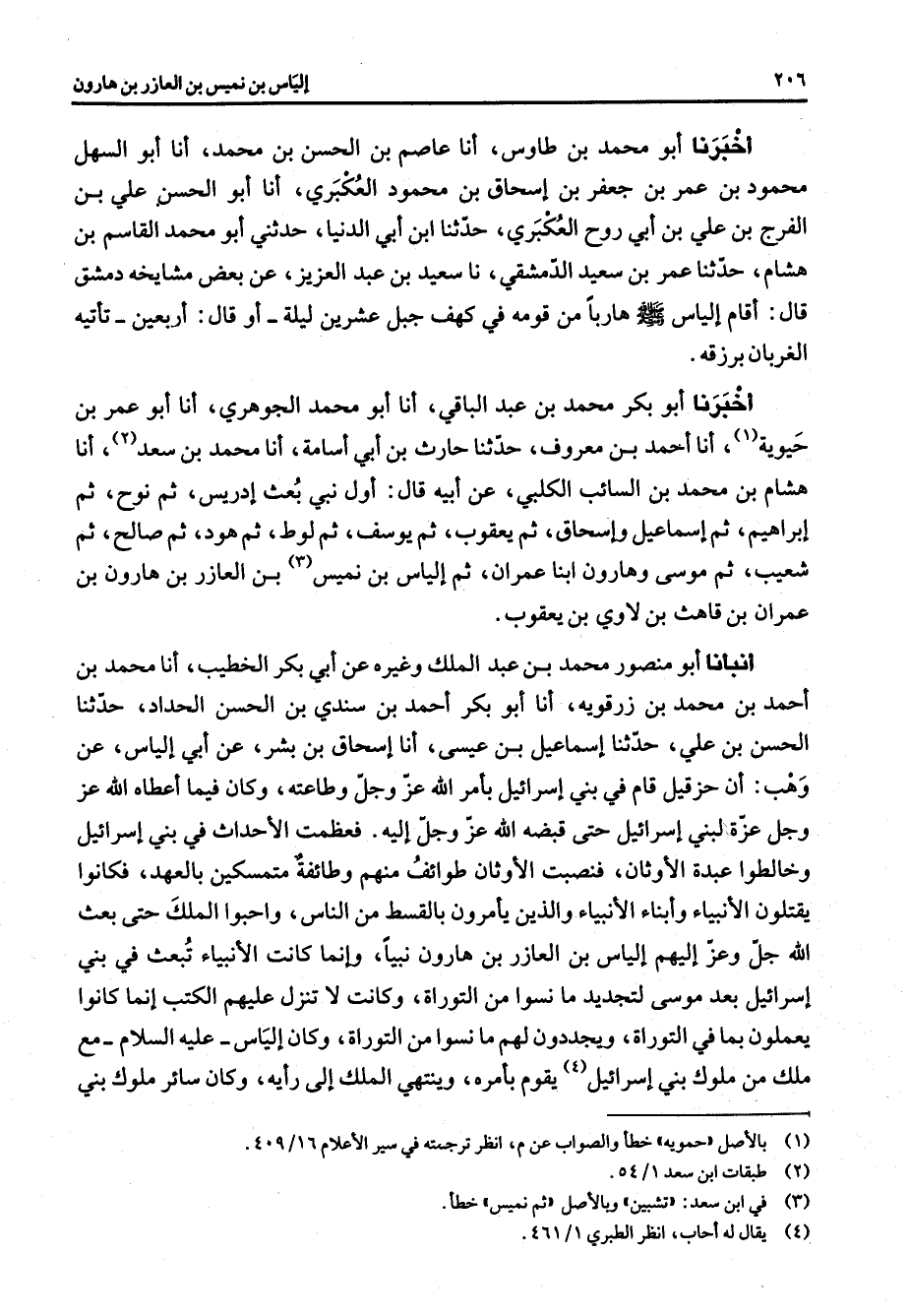أخبرنا أبو محمد بن طاوس أنا عاصم بن الحسن بن محمد أنا أبو السهل محمود بن عمر بن جعفر بن إسحاق بن محمود العكبري أنا أبو الحسن علي بن الفرج بن علي بن أبي روح العكبري حدثنا ابن أبي الدنيا حدثني أبو محمد القاسم بن هشام حدثنا عمر بن سعيد الدمشقي نا سعيد بن عبد العزيز عن بعض مشايخه دمشق قال أقام إلياس (صلى الله عليه وسلم) هاربا من قومه في كهف جبل عشرين ليلة أو قال أربعين تأتيه الغربان برزقه أخبرنا أبو بكر محمد بن عبد الباقي أنا أبو محمد الجوهري أنا أبو عمر بن حيوية (1) أنا أحمد بن معروف حدثنا حارث بن أبي أسامة أنا محمد بن سعد (2) أنا هشام بن محمد بن السائب الكلبي عن أبيه قال أول نبي بعث إدريس ثم نوح ثم إبراهيم ثم إسماعيل وإسحاق ثم يعقوب ثم يوسف ثم لوط ثم هود ثم صالح ثم شعيب ثم موسى وهارون ابنا عمران ثم إلياس بن نميس (3) بن العازر بن هارون بن عمران بن قاهث بن لاوي بن يعقوب أنبأنا أبو منصور محمد بن عبد الملك وغيره عن أبي بكر الخطيب أنا محمد بن أحمد بن محمد بن رزقويه أنا أبو بكر أحمد بن سندي بن الحسن الحداد حدثنا الحسن بن علي حدثنا إسماعيل بن عيسى أنا إسحاق بن بشر عن أبي إلياس عن وهب أن حزقيل قام في بني إسرائيل بأمر الله عز وجل وطاعته وكان فيما أعطاه الله عز وجل عزة لبني إسرائيل حتى قبضه الله عز وجل إليه فعظمت الأحداث في بني إسرائيل وخالطوا عبدة الأوثان فنصبت الأوثان طوائف منهم وطائفة متمسكين بالعهد فكانوا يقتلون الأنبياء وأبناء الأنبياء والذين يأمرون بالقسط من الناس وأحبوا الملك حتى بعث الله جل وعز إليهم إلياس بن العازر بن هارون نبيا وإنما كانت الأنبياء تبعث في بني إسرائيل بعد موسى لتجديد ما نسوا من التوراة وكانت لا تنزل عليهم الكتب إنما كانوا يعملون بما في التوراة ويجددون لهم ما نسوا من التوراة وكان إلياس عليه السلام مع ملك من ملوك بني إسرائيل (4) يقوم بأمره وينتهي الملك إلى رأيه وكان سائر ملوك بني