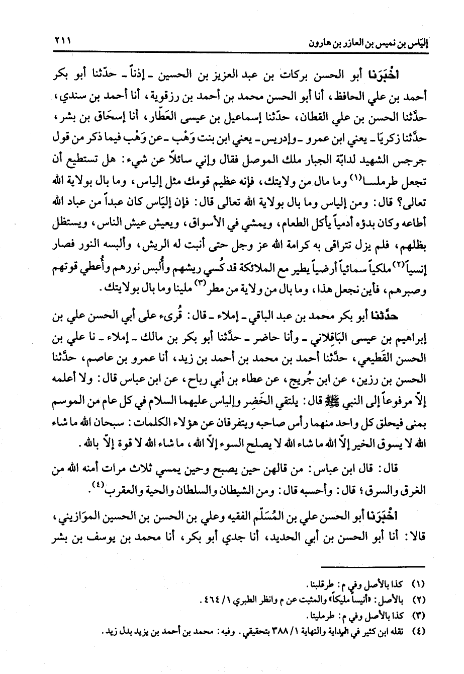 أخبرنا أبو الحسن بركات بن عبد العزيز بن الحسين إذنا حدثنا أبو بكر أحمد بن علي الحافظ أنا أبو الحسن محمد بن أحمد بن رزقويه أنا أحمد بن سندي حدثنا الحسن بن علي القطان حدثنا إسماعيل بن عيسى العطار أنا إسحاق بن بشر حدثنا زكريا يعني ابن عمرو وإدريس يعني ابن بنت وهب عن وهب فيما ذكر من قول جرجس الشهيد لدابة الجبار ملك الموصل فقال وإني سائلا عن شئ هل تستطيع أن تجعل طرملسا (1) وما مال من ولايتك فإنه عظيم قومك مثل إلياس وما بال بولاية الله تعالى قال ومن إلياس وما بال بولاية الله تعالى قال فإن إلياس كان عبدا من عباد الله أطاعه وكان بدؤه أدميا يأكل الطعام ويمشي في الأسواق ويعيش عيش الناس ويستظل بظلهم فلم يزل تتراقى به كرامة الله عز وجل حتى انبت له الريش وألبسه النور فصار إنسيا (2) ملكيا سمائيا أرضيا يطير مع الملائكة قد كسي ريشهم وألبس نورهم وأعطي قوتهم وصبرهم فأين نجعل هذا وما بال من ولاية من مطر (3) ملينا وما بال بولايتك حدثنا أبو بكر محمد بن عبد الباقي إملاء قا قرئ على أبي الحسن علي بن إبراهيم بن عيسى الباقلاني وأنا حاضر حدثنا أبو بكر بن مالك إملاء نا علي بن الحسن القطيعي حدثنا أحمد بن محمد بن أحمد بن زيد أنا عمرو بن عاصم حدثنا الحسن بن رزين عن ابن جريج عن عطاء بن أبي رباح عن ابن عباس قال ولا أعلمه إلا مرفوعا إلى النبي (صلى الله عليه وسلم) قال يلتقي الخضر وإلياس عليهما السلام في كل عام من الموسم بمنى فيحلق كل واحد منهما رأس صاحبه ويتفرقان عن هؤلاء الكلمات سبحان الله ما شاء الله لا يسوق الخير إلا الله ما شاء الله لا يصلح السوء إلا الله ما شاء الله لا قوة إلا بالله قال قال ابن عباس من قالهن حين يصبح وحين يمسي ثلاث مرات أمنه الله من الغرق والسرق قال وأحسبه ومن الشيطان والسلطان والحية والعقرب (4) أخبرنا أبو الحسن علي بن المسلم الفقيه وعلي بن الحسن بن الحسين الموازيني قالا أنا أبو الحسن بن أبي الحديد أنا جدي أبو بكر أنا محمد بن يوسف بن بشر