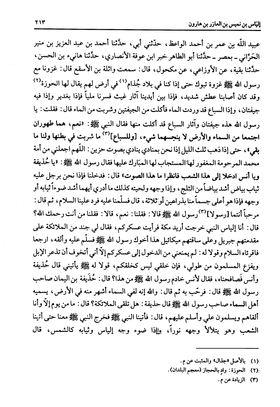 حدثنا بقية عن الأوزاعي عن مكحول قال سمعت واثلة بن الأسقع قال غزونا مع رسول الله (صلى الله عليه وسلم) غزوة تبوك حتى إذا كنا في بلاد جذام (1) في أرض لهم يقال لها الحوزة (2) وقد كان أصابنا عطش شديد فإذا بين أيدينا آثار غيث فسرنا مليا فإذا بغدير وإذا فيه جيفتان وإذا السباع قد وردت المساء فأكلت من الجيفتين وشربت من الماء قال فقلت يا رسول الله هذه جيفتان وآثار السباع قد أكلت منها فقال النبي (صلى الله عليه وسلم) نعم هما طهوران اجتمعا من السماء والأرض لا ينجسهما شئ وللسباع (3) ما شربت في بطنها ولنا ما بقي حتى إذا ذهب ثلث الليل إذا نحن بمنادي ينادي بصوت حزين اللهم اجعلني من أمة محمد المرحومة المغفور لها المستجاب لها المبارك عليها فقال رسول الله (صلى الله عليه وسلم) يا حذيفة ويا أنس ادخلا إلى هذا الشعب فانظر ما هذا الصوت قال فدخلنا فإذا نحن برجل عليه ثياب بياض اشد بياضا من الثلج وإذا وجهه ولحيته كذلك ما أدري أيهما أشد ضوءا ثيابه أو وجهه فإذا هو أعلى جسما منا بذراعين أو ثلاثة قال فسلمنا عليه فرد علينا السلام ثم قال مرحبا أنتما رسولا رسول الله (صلى الله عليه وسلم) قالا فقلنا نعمقالا فقلنا من انت رحمك الله قال أنا إلياس النبي خرجت أريد مكة فرأيت عسكركم فقال لي جند من الملائكة على مقدمتهم جبريل وعلى ساقتهم ميكائيل هذا أخوك رسول الله (صلى الله عليه وسلم) فسلم عليه وألقه ارجعا فاقرئاه السلام وقولا له لم يمنعني من الدخول إلى عسكركم إلا أني أتخوف أن تذعر الإبل ويفزع المسلمون من طولي فإن خلقي ليس كخلقكم قولا له (صلى الله عليه وسلم) يأتيني قال حذيفة وأنس فصافحناه فقال لأنس خادم رسول الله صلى الله عليه وسلم) من هذا قال حذيفة بن اليمان صاحب رسول الله (صلى الله عليه وسلم) قال فرحب به ثم قال والله إنه لفي السماء اشهر منه في الأرض يسميه أهل السماء صاحب رسول الله (صلى الله عليه وسلم) قال حذيفة هل تلقى الملائكة قال ما من يوم إلا وأنا ألقاهم ويسلمون علي واسلم عليهم قال فأتينا النبي (صلى الله عليه وسلم) فخرج النبي (صلى الله عليه وسلم) معنا حتى أتينا الشعب وهو يتلألأ وجهه نورا وإذا ضوء وجه إلياس وثيابه كالشمس قال