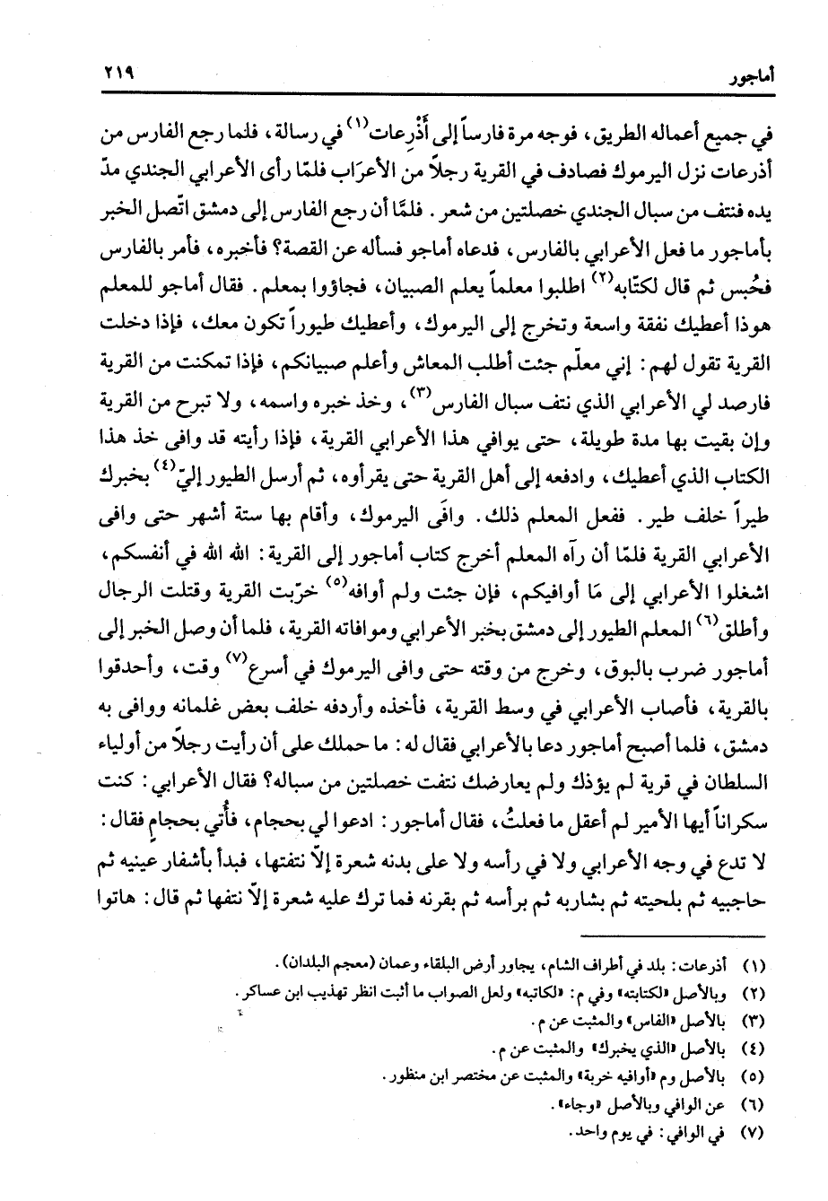 في جميع أعماله الطريق فوجه مرة فارسا إلى أذرعات (1) في رسالة فلما رجع الفارس من أذرعات نزل اليرموك فصادف في القرية رجلا من الأعراب فلما رأى الأعرابي الجندي مد يده فنتف من سبال الجندي خصلتين من شعر فلما أن رجع الفارس إلى دمشق اتصل الخبر بأماجور ما فعل الأعرابي بالفارس فدعاه أماجو فسأله عن القصة فأخبره فأمر بالفارس فحبس ثم قال لكتابه (2) اطلبوا معلما يعلم الصبيان فجاؤوا بمعلم فقال أماجو للمعلم هوذا أعطيك نفقة واسعة وتخرج إلى اليرموك وأعطيك طيورا تكون معك فإذا دخلت القرية تقول لهم إني معلم جئت أطلب المعاش وأعلم صبيانكم فإذا تمكنت من القرية فارصد لي الأعرابي الذي نتف سبال الفارس (3) وخذ خبره واسمه ولا تبرح من القرية وإن بقيت بها مدة طويلة حتى يوافي هذا الأعرابي القرية فإذا رأيته قد وافى خذ هذا الكتاب الذي أعطيتك وادفعه إلى أهل القرية حتى يقرأوه ثم أرسل الطيور إلي (4) بخبرك طيرا خلف طير ففعل المعلم ذلك وافى اليرموك وأقام بها ستة أشهر حتى وافى الأعرابي القرية فلما أن رآه المعلم أخرج كتاب أما جور إلى القرية الله الله في أنفسكم أشغلوا الأعرابي إلى ما أوافيكم فإن جئت ولم أوافه (5) خربت القرية وقتلت الرجال وأطلق (6) المعلم الطيور إلى دمشق بخبر الأعرابي وموافاتة القرية فلما أن وصل الخبر إلى أما جور ضرب بالبوق وخرج من وقته حتى وافى اليرموك في أسرع (7) وقت وأحدقوا بالقرية فأصاب الأعرابي في وسط القرية فأخذه وأردفه خلف بعض غلمانه ووافى به دمشق فلما أصبح أما جور دعا بالأعرابي فقال له ما حملك على أن رأيت رجلا من أولياء السلطان في قرية لم يؤذك ولم يعارضك نتفت خصلتين من سباله فقال الأعرابي كنت سكرانا أيها الأمير لم أعقل ما فعلت فقال أما جور ادعو لي بحجام فأتي بحجام فقال لا تدع في وجه الأعرابي ولا في رأسه ولا على بدنه شعرة إلا نتفتها فبدأ بأشفار عينيه ثم حاجبيه ثم بلحيته ثم بشاربه ثم برأسه ثم بقرنه فما ترك عليه شعرة إلا نتفها ثم قال هاتوا