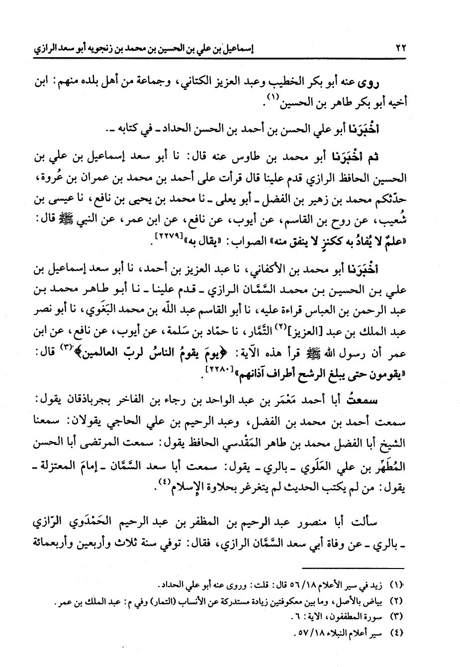 روى عنه أبو بكر الخطيب وعبد العزيز الكتاني وجماعة من أهل بلدة منهم ابن أخيه أبو بكر بن طاهر بن الحسين (1) أخبرنا أبو علي الحسن بن أحمد بن الحسن الحداد في كتابه ثم أخبرنا أبو محمد بطاوس عنه قال نا أبو سعد إسماعيل بن علي بن الحسين الحافظ الرازي قدم علينا قال قرأت على أحمد بن محمد بن عمران بن عروة حدثكم محمد بن زهير بن الفضل أبو يعلى نا محمد بن يحيى بن نافع نا عيسى بن شعيب عن روح بن القاسم عن أيوب عن نافع عن ابن عمر عن النبي (صلى الله عليه وسلم) قال علم لا يفاد به ككنز لا ينفق منه الصواب يقال به أخبرنا أبو محمد بن الأكفاني نا عبد العزيز بن أحمد نا أبو سعد إسماعيل بن علي بن الحسين بن محمد السمان الرازي قدم علينا نا أبو طاهر محمد بن عبد الرحمن بن العباس قراءة عليه نا أبو القاسم عبد الله بن محمد البغوي نا أبو نصر عبد الملك بن عبد العزيز (2) التمار نا حماد بن سلمة عن أيوب عن نافع عن ابن عمر أن رسول الله (صلى الله عليه وسلم) قرأ هذه الآية " يوم يقوم الناس لرب العالمين " (3) قال يقومون حتى يبلغ الرشح أطراف آذانهم سمعت أبا أحمد معمر بن عبد الواحد بن رجاء بن الفاخر بجرباذقان يقول سمعت أحمد بن محمد بن الفضل وعبد الرحيم بن علي الحاجي يقولان سمعنا الشيخ أبا الفضل محمد بن طاهر المقدسي الحافظ يقول سمعت المرتضى أبا الحسن المطهر بن علي العلوي بالري يقول سمعت أبا سعد السمان إمام المعتزلة يقول من لم يكتب الحديث لم يتغرغر بحلاوة الإسلام (4) سألت أبا منصور عبد الرحيم بن المظفر بن عبد الرحيم الحمدوي الرازي بالري عن وفاة أبي سعد السمان الرازي فقال توفي سنة ثلاث وأربعين وأربعمائة