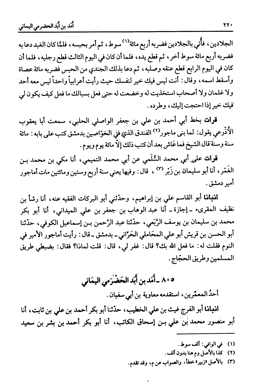 805 - أمد بن أبد الحضرمي اليماني أحد المعمرين استقدمه معاوية بن أبي سفيان أنبأنا أبو الفرج غيث بن علي الخطيب حدثنا أبو بكر أحمد بن علي بن ثابت أنا أبو منصور محمد بن علي بن إسحاق الكاتب أنا أبو بكر أحمد بن بشر بن سعيد