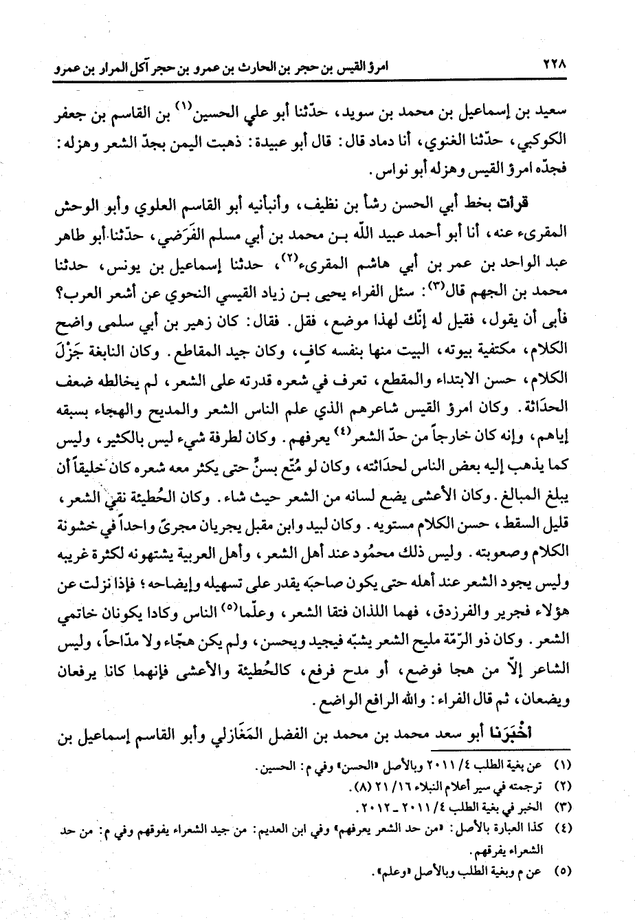 سعيد بن إسماعيل بن محمد بن سويد حدثنا أبو علي الحسين (1) بن القاسم بن جعفر الكوكبي حدثنا الغنوي أنا دماد قال قال أبو عبيدة ذهبت إلى اليمن بجد الشعر وهزله فجده امرؤ القيس وهزله أبو نواس قرأت بخط أبي الحسن رشأ بن نظيف وأنبأنيه أبو القاسم العلوي وأبو الوحش المقرئ عنه أنا أبو أحمد عبيد الله بن محمد بن أبي مسلم الفرضي حدثنا أبو طاهر عبد الواحد بن عمر بن أبي هاشم المقرئ (2) حدثنا إسماعيل بن يونس حدثنا محمد بن الجهم قال (3) سئل الفراء يحيى بن زياد القيسي النحوي عن أشعر العرب فأبى أن يقول فقيل له إنك لهذا موضع فقل فقال كان زهير بن أبي سلمى واضح الكلام مكتفية بيوته البيت منها بنفسه كاف وكان جيد المقاطع وكان النابغة جزل الكلام حسن الابتداء والمقطع تعرف في شعره قدرته على الشعر لم يخالطه ضعف الحداثة وكان امرؤ القيس شاعرهم الذي علم الناس الشعر والمديح والهجاء بسبقه إياهم وإنه كان خارجا من حد الشعر يعرفهم وكان لطرفة شئ ليس بالكثير وليس (4) وليس كما يذهب إليه بعض الناس لحداثته وكان لو متع بسن حتى يكثر معه شعره كان خليقا أن يبلغ المبالغ وكان الأعشى يضع لسانه من الشعر حيث شاء وكان الحطيئة نقي الشعر قليل السقط حسن الكلام مستويه وكان لبيد وابن مقبل يجريان مجرى واحدا في خشونة الكلام وصعوبته وليس ذلك محمود عند أهل الشعر وأهل العربية يشتهونه لكثرة غريبه وليس يجود الشعر عند أهله حتى يكون صاحبه يقدر على تسهيله وإيضاحه فإذا نزلت عن هؤلاء فجرير والفرزدق فهما اللذان فتقا الشعر وعلما الناس وكادا يكونان خاتمي (5) الشعر وكان ذو الرمة مليح الشعر يشبه فيجيد ويحسن ولم يكن هجاء ولا مداحا وليس الشعر إلا من هجا فوضع أو مدح فرفع كالحطيئة والأعشى فإنهما كانا يرفعان ويضعان ثم قال الفراء والله الرافع الواضع أخبرنا أبو سعد محمد بن محمد بن الفضل المغازلي وأبو القاسم إسماعيل بن