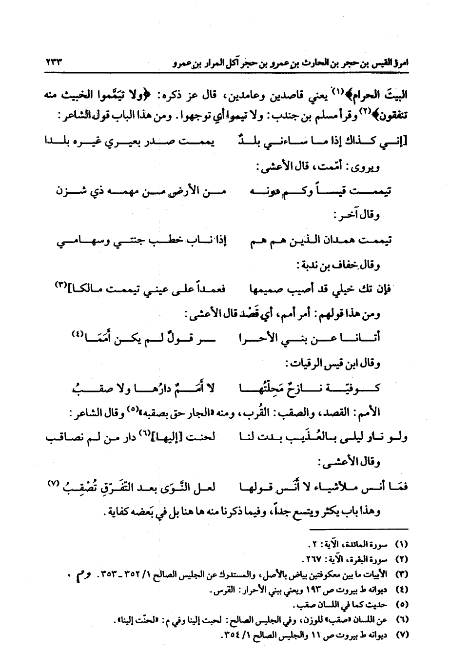 البيت الحرام " (1) يعني قاصدين وعامدين قال عز ذكره " ولا تيمموا الخبيث منه تنفقون " (2) وقرأ مسلم بن جندب ولا تيموا أي توجهوا ومن هذا الباب قول الشاعر * إني كذاك إذا ما ساءني بلد * يممت صدر بعيري غيره بلدا ويروى أممت قال الأعشى (تيممت قيسا وكم دونه * من الارض من مهمة ذي شزن * وقال آخر * تيممت همدان الذين هم هم * إذا ناب خطب جنتني وسهامي * وقال خفاف بن ندبة * فإن تك خيلي قد أصيب صميمها * فعمدا على عيني تيممت مالكا * (3) ومن هذا قولهم أمر أمم أي قصد قال الأعشى * أتانا عن بني الأحر * قول لم يكن أمما * (4) وقال ابن قيس الرقيات * كوفية نازح محلتها * لا أمم دارها ولا صقب * الأمم القصد والصقب القرب ومنه الجار حتى بصقبه وقال الشاعر * ولو نار ليلى بالعذيب بدت لنا * لحنت إليها (6) دار من لم نصاقب * وقال الأعشى * فما أنس لأشياء لا أنس قولها * لعل النوى بعد التفرق تصقب * (7) وهذا باب يكثر ويتسع جدا وفيما ذكرنا منه ها هنا بل في بعض كفاية
