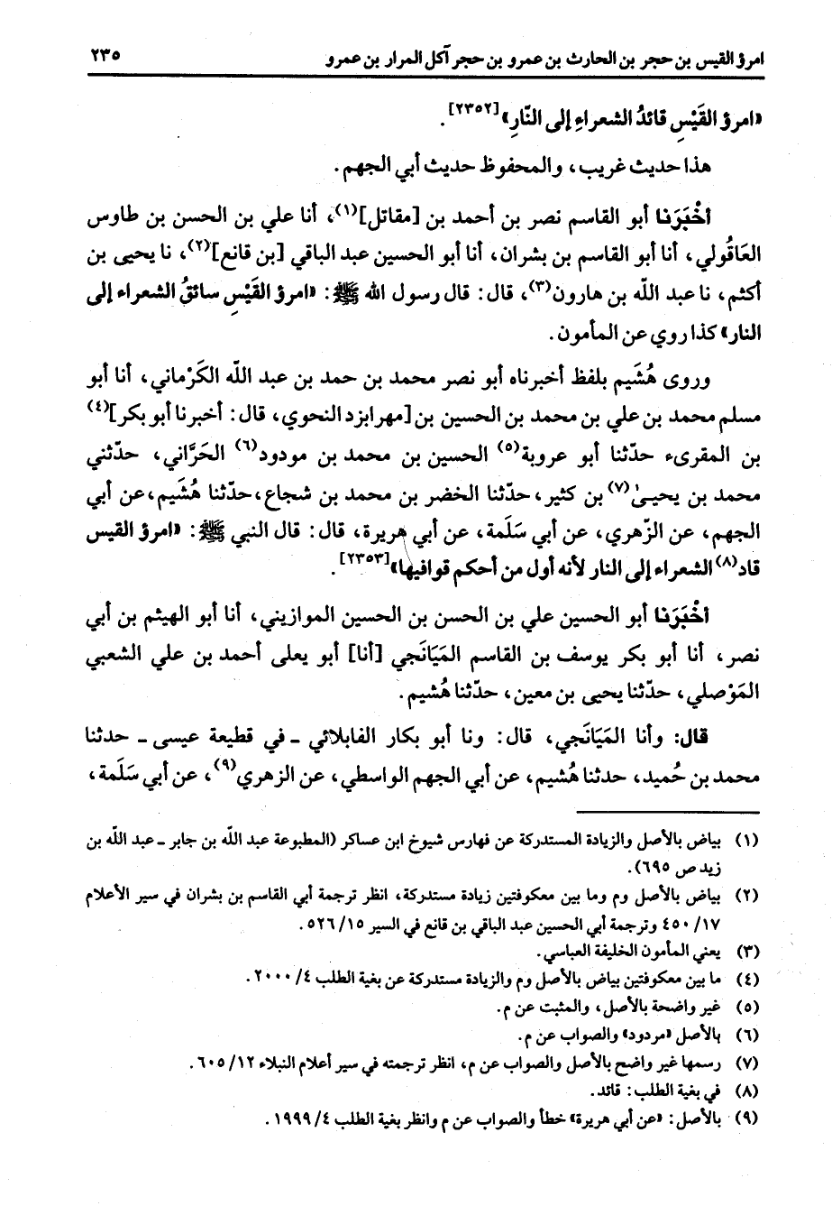 امرؤ القيس قائد الشعراء إلى النار هذا حديث غريب والمحفوظ حديث أبي الجهم أخبرنا أبو القاسم نصر بن أحمد بن مقاتل (1) أنا علي بن الحسن بن طاوس العاقولي أنا أبو القاسم بن بشران أنا أبو الحسين عبد الباقي بن قانع (2) نا يحيى بن اكثم نا عبد الله بن هارون (3) قال قال رسول الله (صلى الله عليه وسلم) امرؤ القيس سائق الشعراء إلى النار كذا روي عن المأمون وروي هشيم بلفظ أخبرناه أبو نصر محمد بن حمد بن عبد الله الكرماني أنا أبو مسلم محمد بن علي بن محمد الحسين بن مهرابزد النحوي قال أخبرنا أبو بكر (4) بن المقرئ حدثنا أبو عروبة (5) الحسين بن محمد بن مودود (6) الحراني حدثني محمد بن يحيى (7) بن كثير حدثنا الخضر بن محمد بن شجاع حدثنا هشيم عن أبي الجهم عن الزهري عن أبي سلمة عن أبي هريرة قال النبي (صلى الله عليه وسلم) امرؤ القيس قاد (8) الشعراء إلى النار لأنه أول من أحكم قوافيها أخبرنا أبو الحسين علي بن الحسن بن الحسين الموازيني أنا أبو الهيثم بن أبي