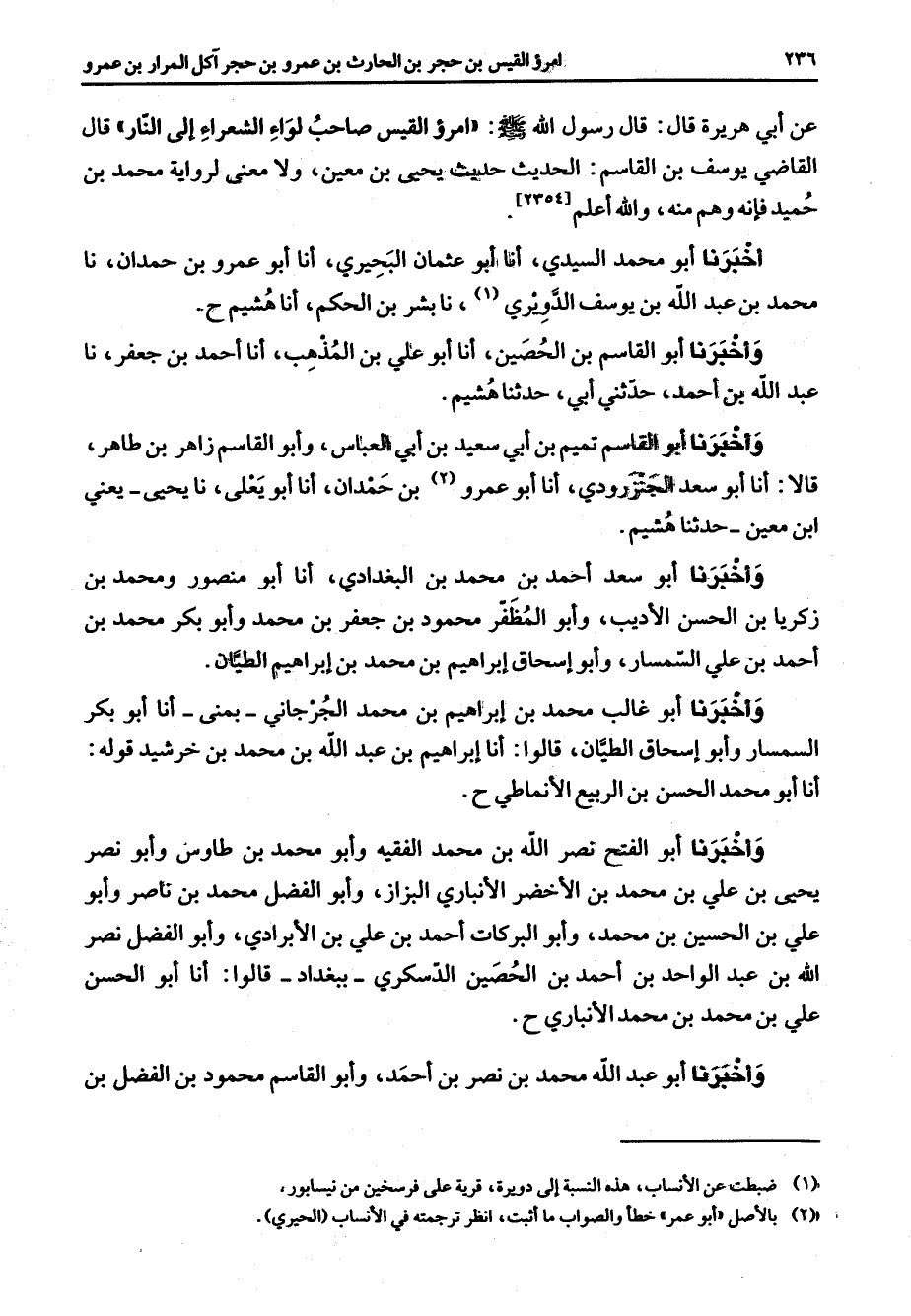 عن أبي هريرة قال قال رسول الله (صلى الله عليه وسلم) امرؤ القيس صاحب لواء الشعراء إلى النار قال القاضي يوسف بن القاسم الحديث حديث يحيى بن معين ولا معنى لرواية محمد بن حميد فإنه وهم منه والله أعلم أخبرنا أبو محمد السيدي أنا أبو عثمان البحيري أنا أبو عمرو بن حمدان نا محمد بن عبد الله بن يوسف الدويري (1) نا بشر بن الحكم أنا هشيم وأخبرنا أبو القاسم بن الحصين أنا أبو علي بن المذهب أنا أحمد بن جعفر نا عبد الله بن أحمد حدثني أبي حدثنا هشيم وأخبرنا أبو القاسم تميم بن أبي سعيد بن أبي العباس وأبو القاسم زاهر بن طاهر قالا أنا أبو سعد الجنزرودي أنا أبو عمرو (2) بن حمدان أنا أبو يعلى نا يحيى يعني ابن معين حدثنا هشيم وأخبرنا أبو سعد أحمد بن محمد بن البغدادي أنا أبو منصور ومحمد بن زكريا بن الحسن الأديب وأبو المظفر محمود بن جعفر بن محمد وأبو بكر محمد بن أحمد بن علي السمسار وأبو إسحاق إبراهيم بن محمد بن إبراهيم الطيان وأخبرنا ابوا غالب محمد بن إبراهيم بن محمد الجرجاني بمنى انا أبو بكر السمسار وابو اسحاق الطيان قالوا أنا إبراهيم بن عبد الله بن محمد بن خرشيد قوله أنا أبو محمد الحسن بن الربيع الأنماطي وأخبرنا أبو الفتح نصر الله بن محمد الفقيه وأبو محمد بن طاوس وأبو نصر يحيى بن علي بن محمد بن الأخضر الأنباري البزاز وأبو الفضل محمد بن ناصر وأبو علي بن الحسين بن محمد وأبو البركات أحمد بن علي بن الأبرادي وأبو الفضل نصر الله بن عبد الواحد بن أحمد بن الحصين الدسكري ببغداد قالوا أنا أبو الحسن علي بن محمد بن محمد الأنباري وأخبرنا أبو عبد الله محمد بن نصر بن أحمد وأبو القاسم محمود بن الفضل بن