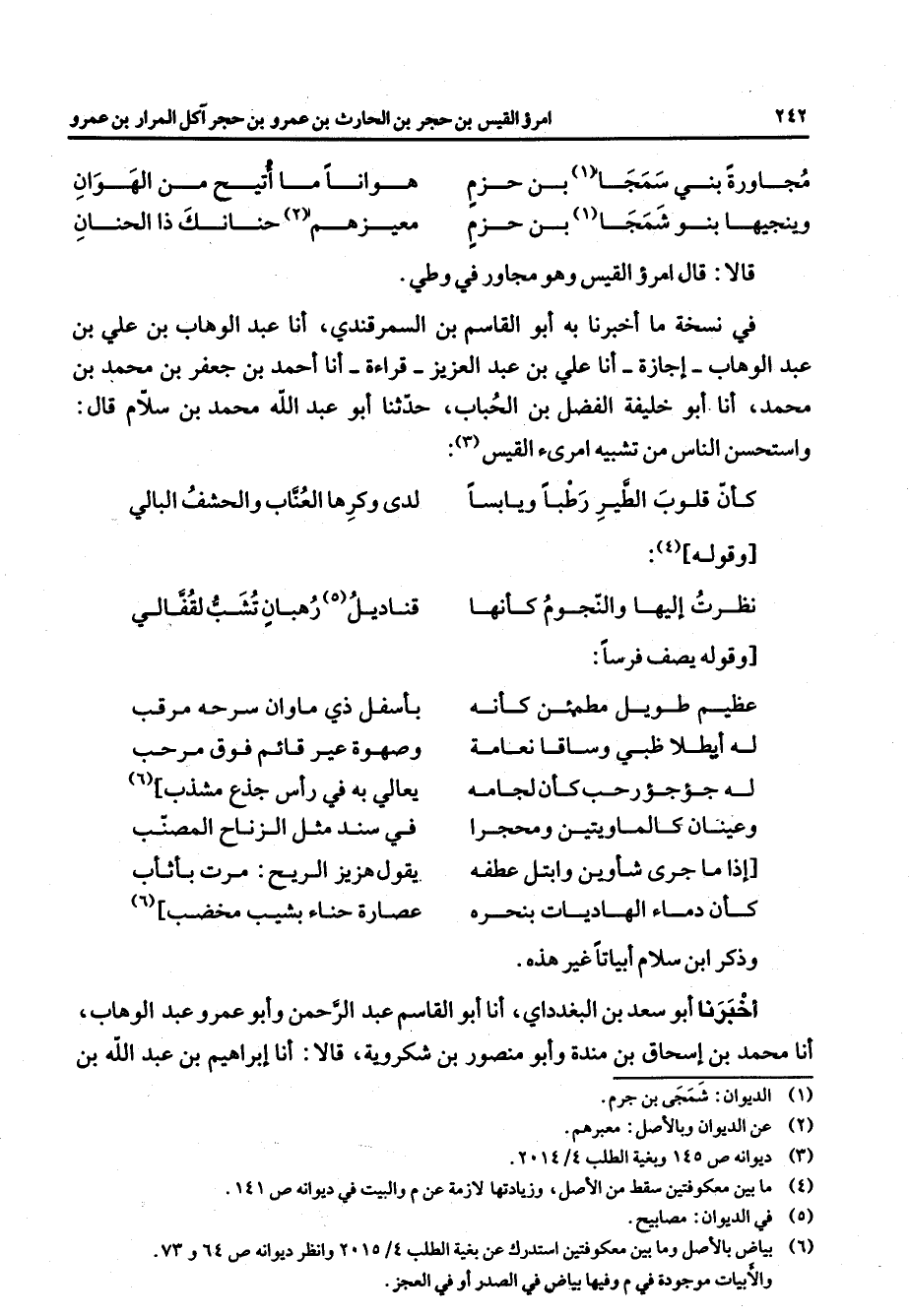 مجاورة بني سمجا (1) بن حزم * هوانا ما أتيح من الهوان وينجيها بنو شعجا (1) بن حزم * معيزهم حنانك ذا الحنان * قالا قال امرؤ القيس وهو مجاور في وطي في نسخة ما أخبرنا به أبو القاسم بن السمرقندي أنا عبد الوهاب بن علي بن عبد الوهاب إجازة أنا علي بن عبد العزيز قراءة أنا أحمد بن جعفر بن محمد بن محمد أنا أبو خليفة الفضل بن الحباب حدثنا أبو عبد الله محمد بن سلام قال واستحسن الناس بن تشيبه امرئ القيس (3) * كأن قلوب الطير ويابسا * لدى وكرها العناب والحشف البالي * وقوله (4) * نظرت إليها والنجوم كأنها * قناديل (5) رهبان تشب لقفالي * وقوله يصف فرسا * عظيم طويل مطمئن كأنه * بأسفل ذي ماوان سرحه مرقب له أيطلا ظبي وساقا نعامة * وصهوة عير قائم فوق مرحب له جؤجؤ رحب كأن لجامه * يعالي به في رأس جذع مشذب (6) وعينان كالماويتين ومحجرا * في سند مثل الزناح المصنب إذا ما جرى شأوين وابتل عطفه * يقول هزيز الريح مرت بأثأب كأن دماء الهاديات بنحره * عصارة حناء بشيب مخضب (6) * وذكر ابن سلام أبياتا غير هذه أخبرنا أبو سعد بن البغدادي أنا أبو القاسم عبد الرحمن وأبو عمرو عبد الوهاب أنا محمد بن إسحاق بن مندة وأبو منصور بن شكروية قالا أنا إبراهيم بن عبد الله بن