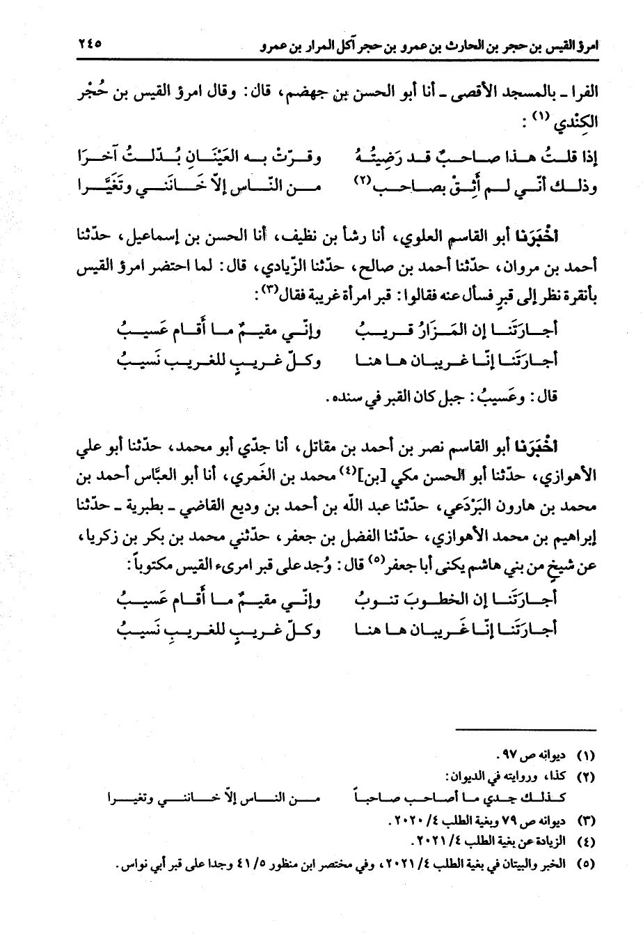 الفرا بالمسجد الأقصى أنا أبو الحسن بن جهضم قال وقال امرؤ القيس بن حجر الكندي * (1) إذا قلت هذا صاحب قد رضيته * وقرت به العينان بدلت آخرا وذلك أني لم أثق بصاحب * (2) من الناس إلا خانني وتغيرا * أخبرنا أبو القاسم العلوي أنا رشأ بن نظيف أنا الحسن بن إسماعيل حدثنا أحمد بن مروان حدثنا أحمد بن صالح حدثنا الزيادي قال لما أحتضر امرؤ القيس بأنقرة نظر إلى قبر فسأل عنه فقالوا قبر امرأة غريبة فقال * (3) أجارتنا إن المزار قريب * وإني مقيم ما أقام عسيب أجارتنا إنا غريبان ها هنا * وكل غريب للغريب نسيب * قال وعسيب جبل كان القبر في سنده أخبرنا أبو القاسم نصر بن أحمد بن مقاتل أنا جدي أبو محمد حدثنا أبو علي الأهوازي حدثنا أبو الحسن مكي بن (4) محمد بن الغمري أنا أبو العباس أحمد بن محمد بن هارون البردعي حدثنا عبد الله بن أحمد بن وديع القاضي بطبرية حدثنا إبراهيم بن محمد الأهوازي حدثنا الفضل بن جعفر حدثني محمد بن بكر بن زكريا عن شيخ من بني هاشم يكنى أبا جعفر (5) قال وجد على قبر امرئ القيس مكتوبا * أجارتنا إن الخطوب تنوب * وإني مقيم ما أقام عسيب أجارتنا إنا غريبا هاهنا * وكل غريب للغريب نسيب *