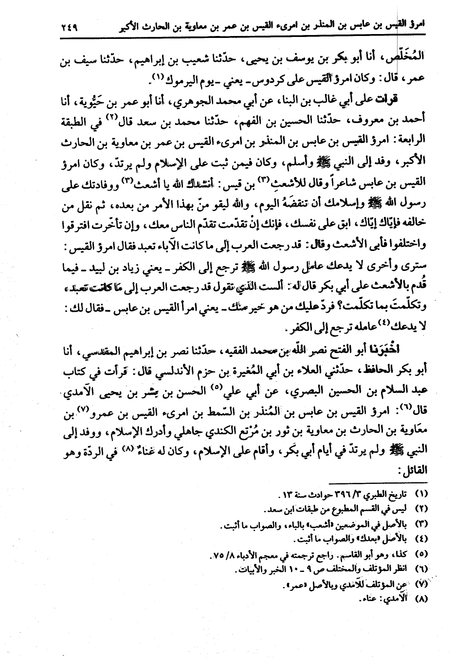 المخلص أنا أبو بكر بن يوسف بن يحيى حدثنا شعيب بن إبراهيم حدثنا سيف بن عمر قال وكان امرؤ القيس على كردوس يعني يوم اليرموك (1) قرأت على أبي غالب بن البنا عن أبي محمد الجوهري أنا أبو عمر بن حيوية أنا أحمد بن معروف حدثنا الحسين بن الفهم حدثنا محمد بن سعد قال (2) في الطبقة الرابعة امرؤ القيس بن عابس بن المنذر بن امرئ القيس بن عمر بن معاوية بن الحارث الأكبر وفد إلى النبي (صلى الله عليه وسلم) وأسلم وكان فيمن ثبت على الإسلام ولم يرتد وكان امرؤ القيس بن عابس شاعرا وقال للأشعث بن قيس أنشدك الله يا أشعث (3) ووفادتك على رسول الله (صلى الله عليه وسلم) وإسلامك أن تنقضه اليوم والله ليقومن بهذا الأمر من بعده ثم نقل من خالفه فإياك إياك ابق على نفسك فإنك إن تقدمت تقدم الناس معك وإن تأخرت افترقوا واختلفوا فأبى الأشعث وقال قد رجعت العرب إلى ما كانت الآباء تعبد فقال امرؤ القيس سترى وأخرى لا يدعك عامل رسول الله (صلى الله عليه وسلم) ترجع إلى الكفر يعني زياد بن لبيد فيما قدم بالأشعث على أبي بكر قال له ألست الذي تقول قد رجعت العرب إلى ما كانت تعبد وتكلمت بما تكلمت فرد عليك من هو خير منك يعني امرأ القيس بن عابس فقال لك لا يدعك (4) عامله ترجع إلى الكفر أخبرنا أبو الفتح نصر الله بن محمد الفقيه حدثنا نصر بن إبراهيم المقدسي أنا أبو بكر الحافظ حدثني العلاء بن أبي المغيرة بن حزم الأندلسي قال قرأت في كتاب عبد السلام بن الحسين البصري عن أبي علي (5) الحسن بن بشر بن يحيى الآمدي قال (6) امرؤ القيس بن عابس بن المنذر بن السمط بن امرئ القيس بن عمرو (7) بن معاوية بن الحارث بن معاوية بن ثور بن مرتع الكندي جاهلي وأدرك الإسلام ووفد إلى النبي (صلى الله عليه وسلم) ولم يرتد في أيام أبي بكر وأقام على الإسلام وكان له غناء (8) في الردة وهو القائل *