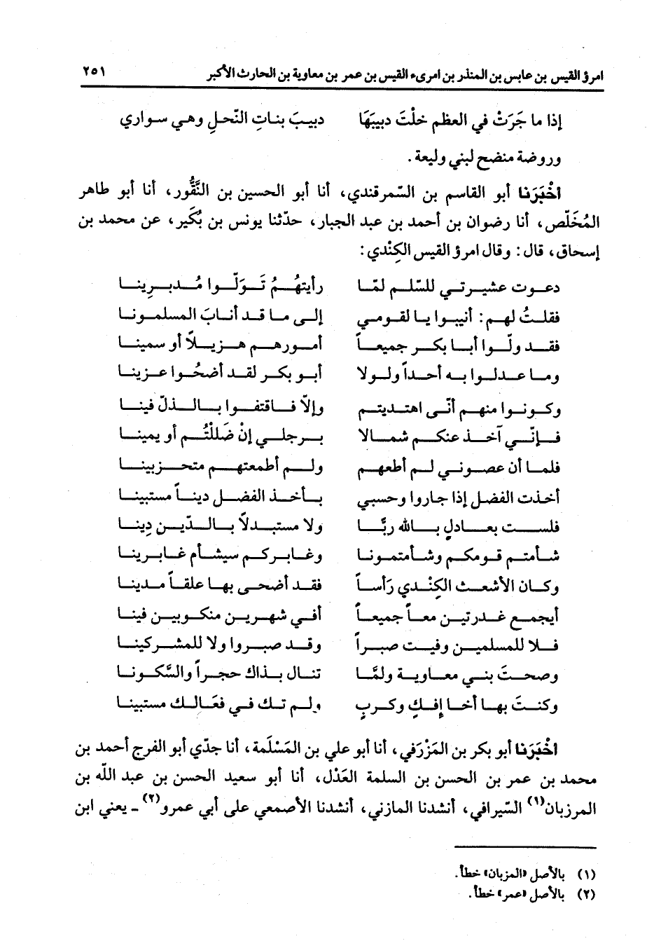 إذا ما جرت في العظم خلت دبيبها * دبيب بنات النحل وهي سواري * وروضة منضح لبني وليعة أخبرنا أبو القاسم بن السمرقندي أنا أبو الحسين بن النقور أنا أبو طاهر المخلص أنا رضوان بن أحمد بن عبد الجبار حدثنا يونس بن بكير عن محمد بن إسحاق قال وقال امرؤ القيس الكندي * دعوت عشيرتي للسلم لما * رأيتهم تولوا مدبرينا فقلت لهم أنيبوا يا لقومي * إلى ما قد أناب المسلمونا فقد ولوا أبا بكر جميعا * أمورهم هزيلا أو سمينا * * وما عدلوا به أحدا ولولا * أبو بكر لقد أضحوا عزينا وكونوا منهم أنى أهتديتم * وإلا فاقتفوا بالذل فينا فإني آخذ عنكم شمالا * برجلي إن ضللتم أو يمينا فلما أن عصوني لم أطعهم * ولم أطمعتهم متحزبينا أخذت الفضل إذا جاروا وحسبي * بأخذ الفضل دينا مستبينا فلست بعادل بالله ربا * ولا مستبدلا بالدين دينا شأمتم قومكم وشأمتمونا * وغابركم سيشأم غابرينا وكان الأشعث الكندي رأسا * فقد أضحى بها علقا مدينا أيجمع غدرتين معا جميعا * أفي شهرين منكوبين فينا فلا للمسلمين وفيت صبرا * وقد صبروا ولا للمشركينا وصحت بني معاوية ولما * تنال بذاك حجرا والسكونا وكنت بها أخا إفك وكرب * ولم تك في فعالك مستبينا * أخبرنا أبو بكر بن المزرفي أنا أبو علي بن المسلمة أنا جدي أبو الفرج أحمد بن محمد بن عمر بن الحسن بن السلمة العدل أنا أبو سعيد الحسن بن عبد الله بن المرزبان (1) السيرافي أنشدنا المازني أنشدنا الأصمعي على أبي عمرو (2) يعني ابن