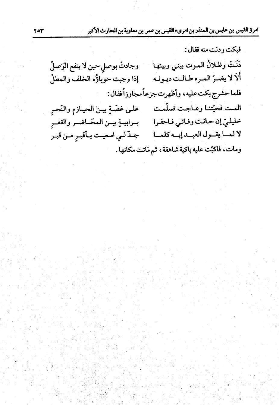 فبكت ودنت منه فقال * دنت وظلال الموت بيني وبينها * وجادت بوصل حين لا ينفع الوصل ألا لا يضر المرء طالت ديونه * إذا وجبت حوباؤه الخلف والمطل * فلما حشرج بكت عليه وأظهرت جزعا مجاوزا فقال * ألمت فحيتنا وعاجت فسلمت * على غصة بين الحيازم والنحر خليلي إن حانت وفاتي فاحفرا * برابية بين المحاضر والقفر لا لما يقول العبد إيه كلما * جد لي اسعيت بأقبر من قبر * ومات فاكبت عليه باكية شاهقة ثم ماتت مكانها "
