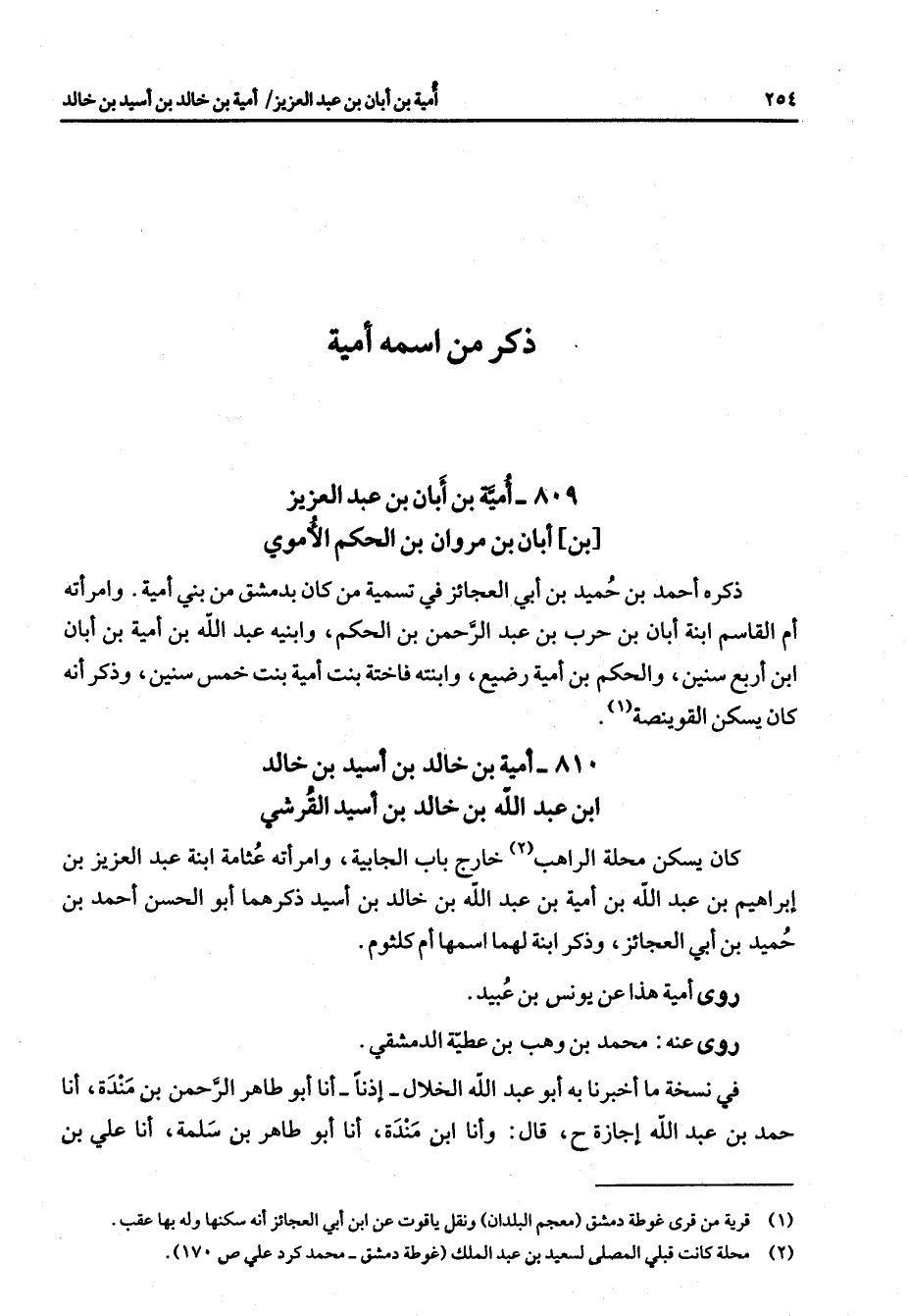810 - أمية بن خالد بن أسيد بن خالد ابن عبد الله بن خالد بن أسيد القرشي كان يسكن محلة الراهب خارج باب الجابية وامرأته عثامة ابنة عبد العزيز بن إبراهيم بن عبد الله بن امية بن عبد الله بن خالد بن أسيد ذكرهما أبو الحسن أحمد بن حميد بن أبي العجائز وذكر ابنة لهما اسمها أم كلثوم روى أمية هذا عن يونس بن عبيد روى عنه محمد بن وهب بن عطية الدمشقي في نسخة ما أخبرنا به أبو عبد الله الخلال إذنا أنا أبو طاهر الرحمن بن مندة أنا حمد بن عبد الله إجازة ح قال وأنا ابن مندة أنا أبو طاهر بن سلمة أنا علي بن