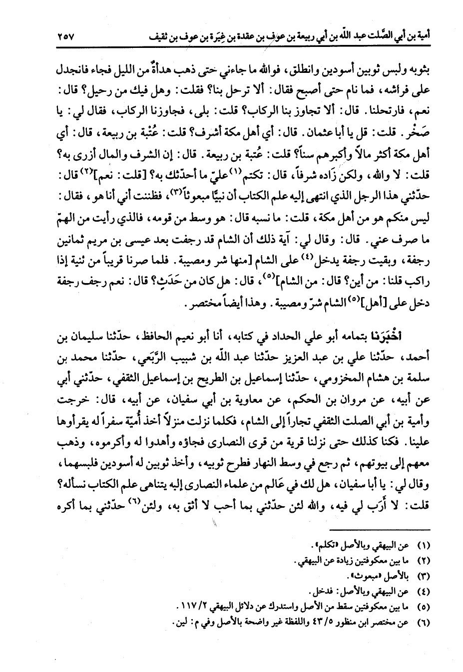 بثوبه ولبس ثوبين أسودين وانطلق فوالله ما جاءني حتى ذهب هدأة من الليل فجاء فانجدل على فراشه فما نام حتى أصبح فقال ألا ترحل بنا فقلت وهل فيك من رحيل قال نعم فارتحلنا قال ألا تجاوز بنا الركاب قلت بلى فجاوزنا الركاب فقال لي يا صخر قلت قل يا أبا عثمان قال أي أهل مكة أشرف قلت عتبة بن ربيعة قال أي أهل مكة أكثر مالا وأكبرهم سنا قلت عتبة بن ربيعة قال إن الشرف والمال أزرى به قلت لا والله ولكن زاده شرفا قال تكتم (1) علي ما أحدثك به قلت نعم (2) قال حدثني هذا الرجل الذي انتهى إليه علم الكتاب أن نبيا مبعوثا (3) فظننت أني أنا هو فقال ليس منكم هو من أهل مكة قلت ما نسبه قال هو وسط من قومه فالذي رأيت من الهم ما صرف عني قال وقال لي آية ذلك أن الشام قد رجفت بعد عيسى بن مريم ثمانين رجفة وبقيت رجفة يدخل (4) على الشام منها شر ومصيبة فلما صرنا قريبا من ثنية إذا راكبقلنا من أين قال من الشام (5) قال هل كان من حدث قال نعم رجف رجفة دخل على أهل الشام شر ومصيبة وهذا أيضا مختصر أخبرنا بتمامه أبو علي الحداد في كتابه أنا أبو نعيم الحافظ حدثنا سليمان بن أحمد حدثنا علي بن عبد العزيز حدثنا عبد الله بن شبيب الربعي حدثنا محمد بن سلمة بن هشام المخزومي حدثنا إسماعيل بن الطريح بن إسماعيل الثقفي حدثني أبي عن أبيه عن مروان بن الحكم عن معاوية بن أبي سفيان عن أبيه قال خرجت وأمية بن أبي الصلت الثقفي تجارا إلى الشام فكلما نزلت منزلا أخذ أمية سفرا له يقرأوها علينا فكنا كذلك حتى نزلنا قرية من قرى النصارى فجاؤه وأهدوا له وأكرموه وذهب معهم إلى بيوتهم ثم رجع في وسط النهار فطرح ثوبيه وأخذ ثوبين له أسودين فلبسهما وقال لي يا أبا سفيان هل لك في عالم من علماء النصارى إليه يتناهى علم الكتاب نسأله قلت لا أرب لي فيه والله لئن حدثني بما أحب لا أثق به ولئن (6) حدثني بما أكره