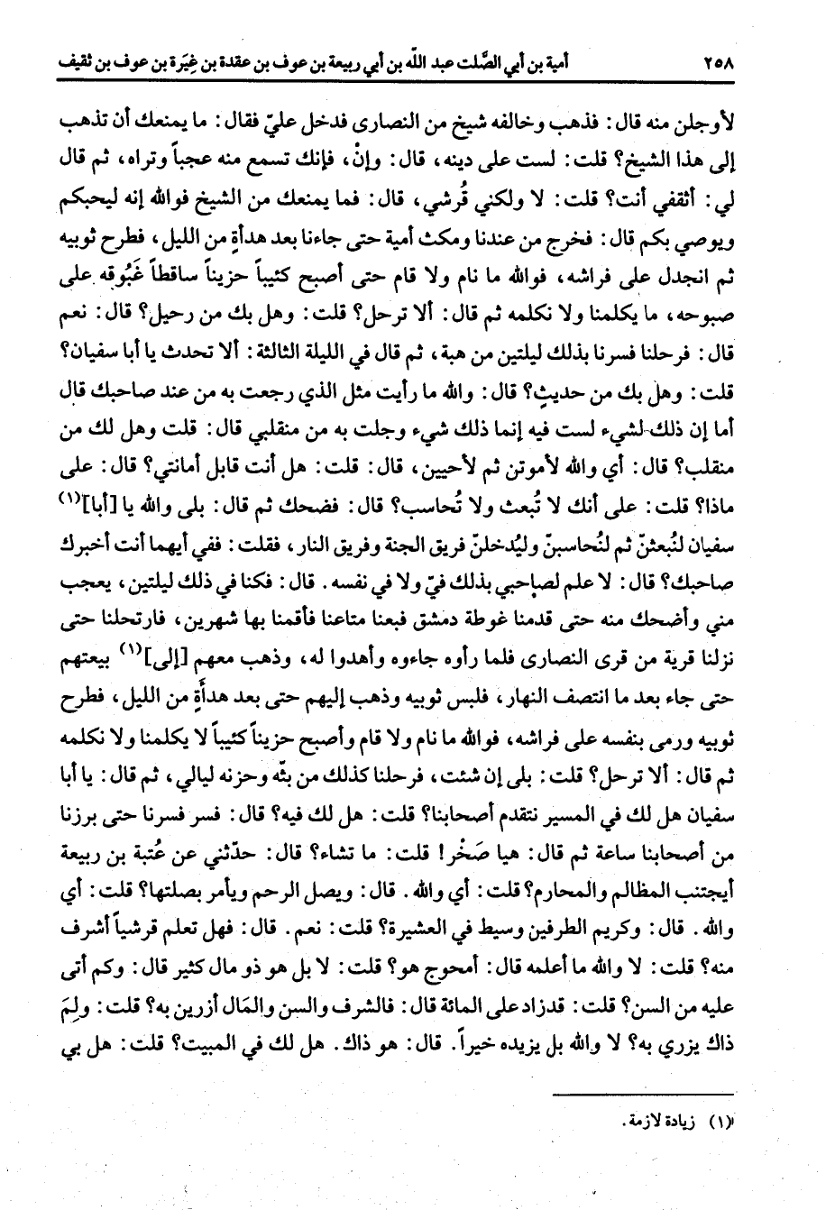 لأوجلن منه قال فذهب وخالفه شيخ من النصارى فدخل علي فقال ما يمنعك أن تذهب إلى هذا الشيخ قلت لست على دينه قال وإن فإنك تسمع منه عجبا وتراه ثم قال لي أثقفي أنت قلت لا ولكني قرشي قال فما يمنعك من الشيخ فوالله إنه ليحبكم ويوصي بكم قال فخرج من عندنا ومكث أمية حتى جاءنا بعد هدأة من الليل فطرح ثوبيه ثم انجدل على فراشه فوالله ما نام ولا قام حتى أصبح كئيبا حزينا ساقطا غبوقه على صبوحه ما يكلمنا ولا نكلمه ثم قال ألا ترحل قلت وهل بك من رحيل قال نعم قال فرحلنا فسرنا بذلك ليلتين من هبة ثم قال في الليلة الثالثة ألا تحدث يا أبا سفيان قلت وهل بك من حديث قال والله ما رأيت مثل الذي رجعت به من عند صاحبك قال أما إن ذلك لشئ لست فيه إنما ذلك شئ وجلت به من منقلبي قال قلت وهل لك من منقلب قال أي والله لأموتن ثم لأحيين قال قلت هل أنت قابل أمانتي قال على ماذا قلت على انك لا تبعث ولا تحاسب قال فضحك ثم قال بلى والله يا أبا (1) سفيان لنبعثن ثم لنحاسبن وليدخلن فريق الجنة وفريق النار فقلت ففي أيهما أنت أخبرك صاحبك قال لا علم لصاحبي بذلك في ولا في نفسه قال فكنا في ذلك ليلتين يعجب مني وأضحك منه حتى قدمنا غوطة دمشق فبعنا متاعنا فأقمنا بها شهرين فارتحلنا حتى نزلنا قرية من قرى النصارى فلما رأوه جاءوه وأهدوا له وذهب معهم إلى (1) بيعتهم حتى جاء بعد ما انتصف النهار فلبس ثوبيه وذهب إليهم حتى بعد هدأة من الليل فطرح ثوبيه ورمى بنفسه على فراشه فوالله ما نام ولا قام وأصبح حزينا كئيبا لا يكلمنا ولا نكلمه ثم قال ألا ترحل قلت بلى إن شئت فرحلنا كذلك من بثه وحزنه ليالي ثم قال يا أبا سفيان هل لك في المسير نتقدم أصحابنا قلت هل لك فيه قال فسر فسرنا حتى برزنا من أصحابنا ساعة ثم قال هيا صخر قلت ما تشاء قال حدثني عن عتبة بن ربيعة أيجتنب المظالم والمحارم قلت أي والله قال ويصل الرحم ويأمر بصلتها قلت أي والله قال وكريم الطرفين وسيط في العشيرة قلت نعم قال فهل تعلم قرشيا أشرف منه قلت لا والله ما أعلمه قال أمحوج هو قلت لا بل هو ذو مال كثير قال وكم أتى عليه من السن قلت قد زاد على المائة قال فالشرف والسن والمال أزرين به قلت ولم ذاك يزري به لا والله بل يزيده خيرا قال هو ذاك هل لك في المبيت قلت هل بي (1) زيادة لازمة