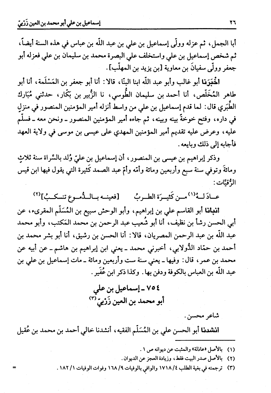 754 - إسماعيل بن علي أبو محمد بن العين زربي (3) شاعر محسن أنشدنا أبو الحسن علي بن المسلم الفقيه أنشدنا خالي أحمد بن محمد بن عقيل