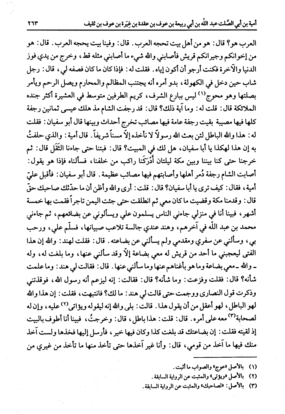 العرب هو قال هو من أهل بيت تحجه العرب قال وفينا بيت يحجه العرب قال هو من إخوانكم وجيرانكم قريش فأصابني والله شئ ما أصابني مثله قط وخرج من يدي فوز الدنيا والآخرة فكنت أرجو أن أكون إياه فقلت له فإذا كان ما كان فصفه لي قال رجل شاب حين دخل في الكهولة بدو أمره أنه يجتنب المظالم والمحارم ويصل الرحم ويأمر بصلتها وهو محوج (1) ليس ببارع الشرف كريم الطرفين متوسط في العشيرة أكثر جنده الملائكة قال قلت له وما آية ذلك قال قد رجفت الشام مذ هلك عيسى ثمانين رجفة كلها فيها مصيبة بقيت رجفة عامة فيها مصائب تخرج أحداث وبينها قال أبو سفيان فقلت له هذا والله الباطل لئن بعث الله رسولا لا نأخذه إلا مسنا شريفا قال أمية والذي حلفت به إن هذا لهكذا يا أبا سفيان هل لك في المبيت قال فبتنا حتى جاءنا الثقل قال ثم خرجنا حتى كنا بيننا وبين مكة ليلتان أدركنا راكب من خلفنا فسألناه فإذا هو يقول أصابت الشام رجفة دمر أهلها وأصابتهم فيها مصائب عظيمة قال أبو سفيان فأقبل علي أمية فقال كيف ترى يا أبا سفيان قال قلت أرى والله وأظن أن ما حدثك صاحبك حق قال وقدمنا مكة وقضيت ما كان معي ثم انطلقت حتى جئت اليمن تاجرا فقمت بها خمسة أشهر فبينا أنا في منزلي جاءني الناس يسلمون علي ويسألوني عن بضائعهم ثم جاءني محمد بن عبد الله في آخرهم وهند عندي جالسة تلاعب صبيانها فسلم علي ورحب بي وسألني عن سفري ومقدمي ولم يسألني عن بضاعته قال فقلت لهند والله إن هذا الفتى ليعجبني ما أحد من قريش له معي بضاعة إلا وقد سألني عنها وما بلغت له وله والله معي بضاعة وما هو بأغناهم عنها وما سألني عنها قال فقالت لي هند وما علمت شأنه قال فقلت وفزعت وما شأنه قال فقالت إنه ليزعم انه رسول الله فوقذتني وذكرت قول النصارى ووجمت حتى قالت لي هند ما لك فانتبهت فقلت إن هذا والله لهو الباطل لهو أعقل من أن يقول هذا قالت بلى والله إنه ليقوله ويؤاتى (2) عليه وإن له لصحابة (3) معه على أمره قال قلت هذا باطل قال وخرجت فبينا أنا أطوف بالبيت إذ لقيته فقلت إن بضاعتك قد بلغت كذا وكان فيها خير فأرسل إليها فخذها ولست آخذ منك فيها ما آخذ من قومي قال وأنا غير آخذها حتى تأخذ منها ما تأخذ من غيري من