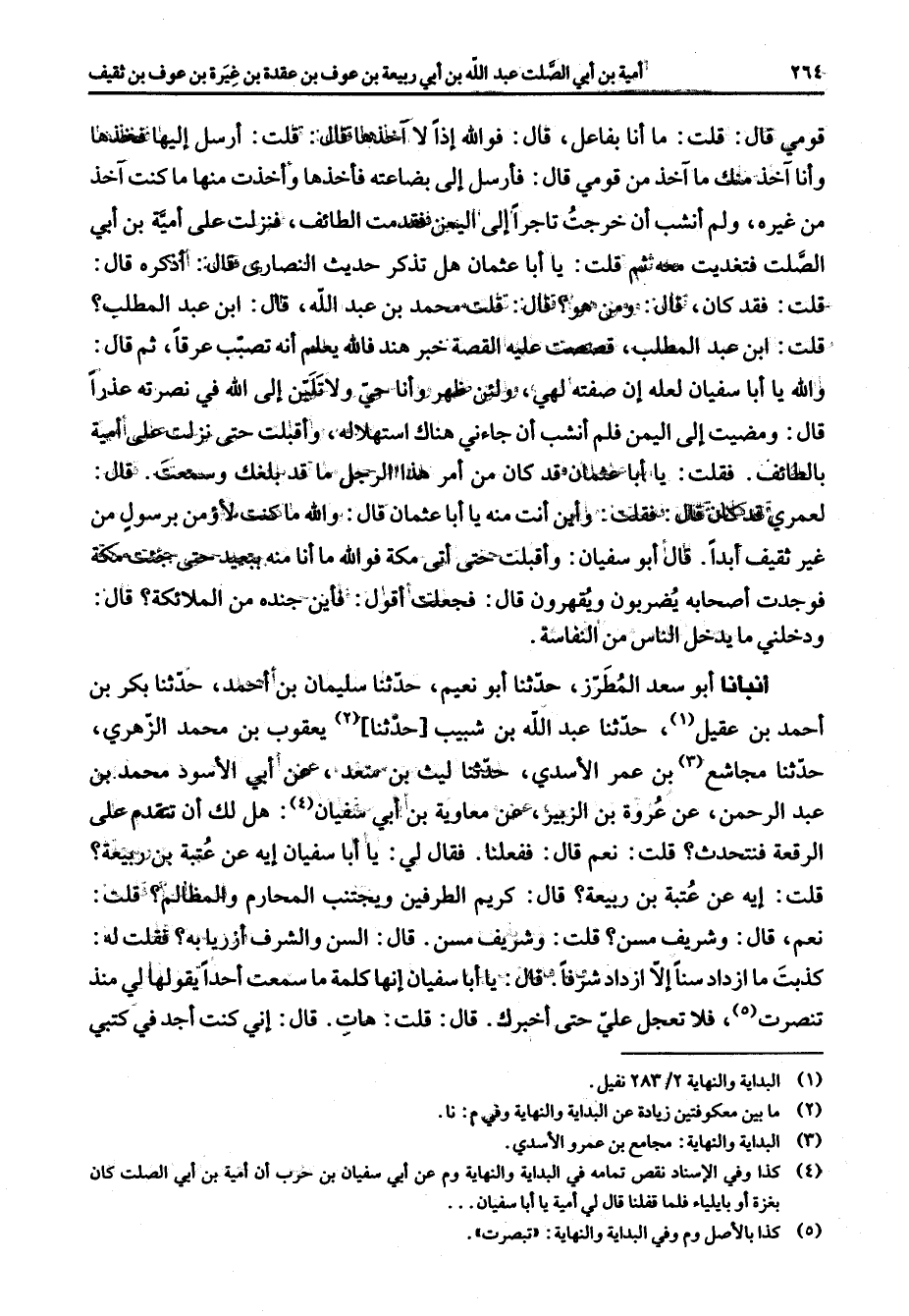 (1) البداية ولنهاية 2 / 283 نفيل (2) مابين معكوفتين زيادة عن البداية والنهاية وفى م: نا (3) الباية والنهاية: مجامع بن عمرو الأسدي (4) كذا وفي الاسناد نقص تمامه في البداية والنهاية وم عن أبي سفيان بن حرب أن أمية بن أبي الصلت كان بغزة أو فلما قفلنا قال لي أمية يا أبا سفيان