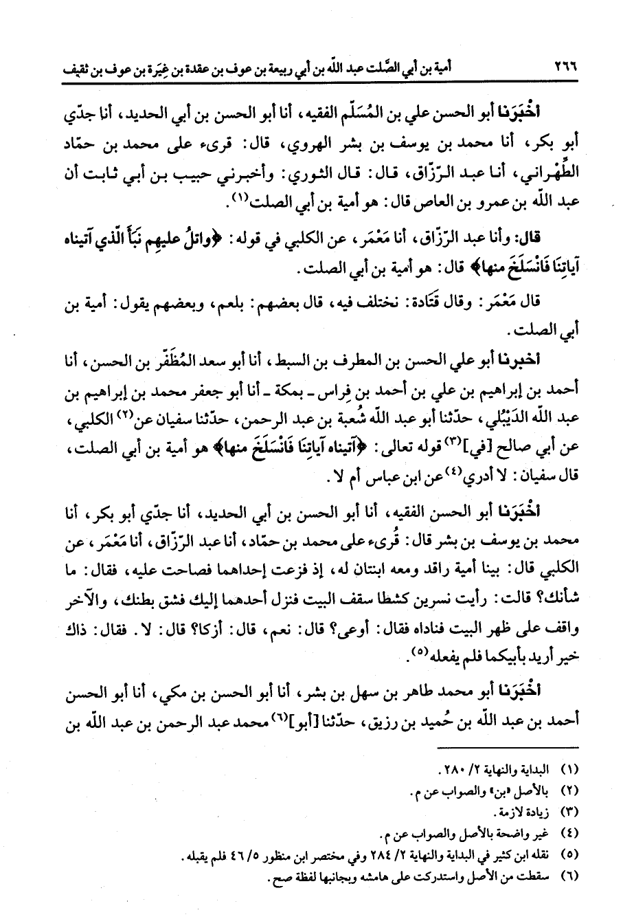 أخبرنا أبو الحسن علي بن المسلم الفقيه أنا أبو الحسن بن أبي الحديد أنا جدي أبو بكر أنا محمد بن يوسف بن بشر الهروي قال قرئ على محمد بن حماد الطهراني أنا عبد الرزاق قال قال الثوري وأخبرني حبيب بن أبي ثابت أن عبد الله بن عمرو بن العاص قال هو أمية بن أبي الصلت (1) قال وأنا عبد الرازق أنا معمر عن الكلبي في قوله " واتل عليهم نبأ الذي آتيناه آياتنا فانسلخ منها " قال هو أمية بن أبي الصلت قال معمر وقال قتادة نختلف فيه قال بعضهم بلعم وبعضهم يقول أمية بن أبي الصلت أخبرنا أبو علي الحسن بن المطرف بن السبط أنا أبو سعد المظفر بن الحسن أنا أحمد بن إبراهيم بن علي بن أحمد بن فراس بمكة أنا أبو جعفر محمد بن إبراهيم بن عبة الله الديبلي حدثنا أبو عبد الله شعبة بن عبد الرحمن حدثنا سفيان عن (2) الكلبي عن أبي صالح في (3) قوله تعالى " آتيناه آياتنا فانسلخ منها " هو أمية بن أبي الصلت قال سفيان لا أدري (4) عن ابن عباس أم لا أخبرنا أبو الحسن الفقيه أنا أبو الحسن بن أبي الحديد أنا جدي أبو بكر أنا محمد بن يوسف بن بشر قال قرئ على محمد بن حماد أنا عبد الرزاق أنا معمر عن الكلبي قال بينا أمية راقد ومعه ابنتان له إذ فزعت إحداهما فصاحت عليه فقال ما شأنك قالت رأيت نسرين كشطا سقف البيت فنزل أحدهما إليك فشق بطنك والآخر واقف على ظهر البيت فناداه فقال أوعى قال نعم قال أزكا قال لا فقال ذاك خير أريد بأبيكما فلم يفعله (5) أخبرنا أبو محمد طاهر بن سهل بن بشر أنا أبو الحسن بن مكي أنا أبو الحسن أحمد بن عبد الله بن حميد بن رزيق حدثنا أبو (6) محمد عبد الرحمن بن عبد الله بن