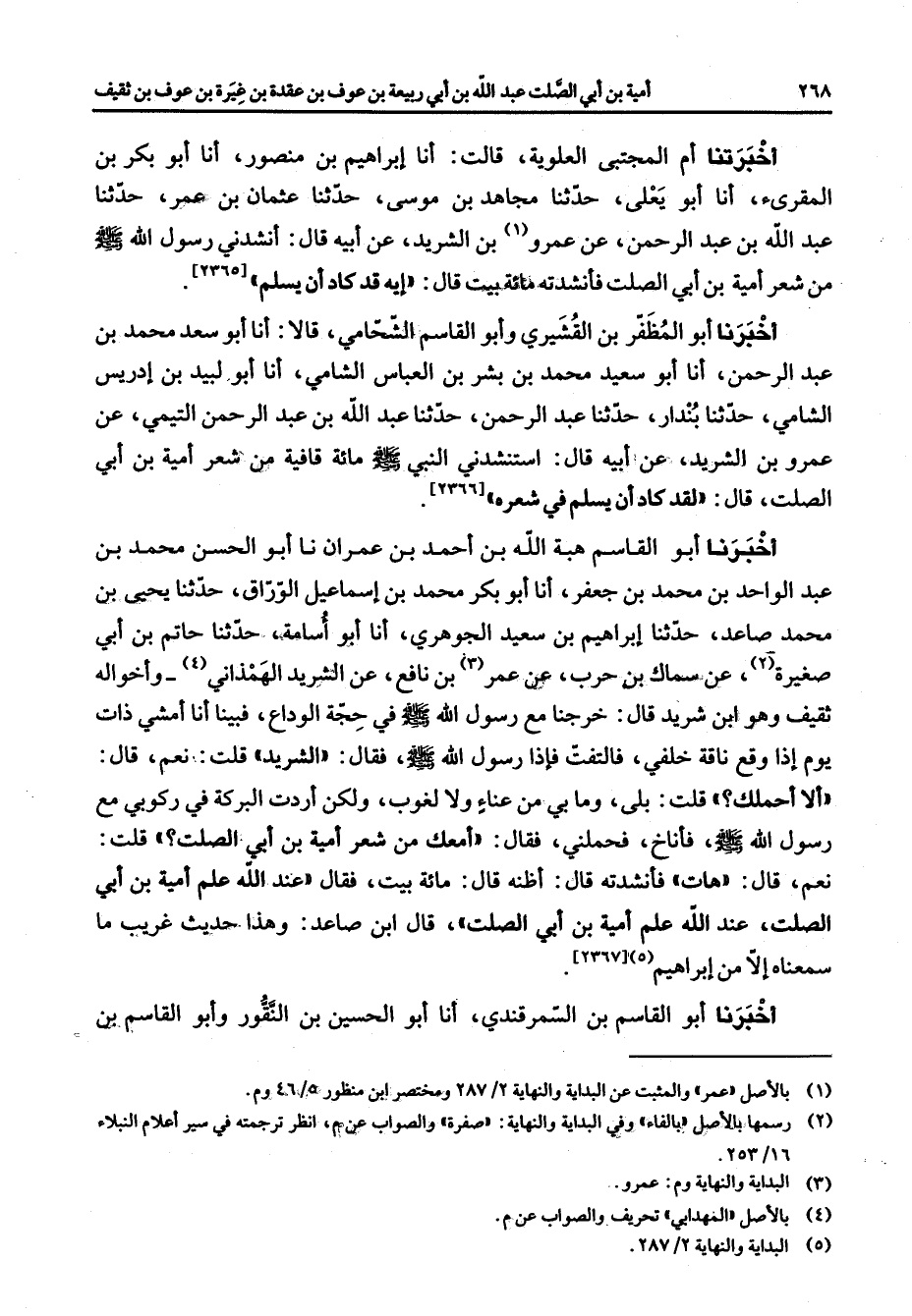 أخبرتنا أم المجتبى العلوية قالت أنا إبراهيم بن منصور أنا أبو بكر بن المقرئ أنا أبو يعلى حدثنا مجاهد بن موسى حدثنا عثمان بن عمر حدثنا عبد الله بن عبد الرحمن عن عمرو (1) بن الشريد عن أبيه قال أنشدني رسول الله (صلى الله عليه وسلم) من شعر أمية بن أبي الصلت فأنشدته مائة بيت قال إيه قد كاد أن يسلم أخبرنا أبو المظفر بن القشيري وأبو القاسم الشحامي قالا أنا أبو سعد محمد بن عبد الرحمن أنا أبو سعيد محمد بن بشر بن العباس الشامي أنا أبو لبيد بن إدريس الشامي حدثنا بندار حدثنا عبد الرحمن حدثنا عبد الله بن عبد الرحمن التيمي عن عمرو بن الشريد عن أبيه قال استنشدني النبي (صلى الله عليه وسلم) مائة قافية من شعر أمية بن أبي الصلت قال لقد كاد أن يسلم في شعره أخبرنا أبو القاسم هبة الله بن أحمد بن عمران نا أبو الحسن محمد بن عبد الواحد بن محمد بن جعفر أنا أبو بكر محمد بن إسماعيل الوراق حدثنا يحيى بن محمد صاعد حدثنا إبراهيم بن سعيد الجوهري أنا أبو أسامة حدثنا حاتم بن أبي صغيرة (3) عن سماك بن حرب عن عمر بن نافع عن الشريد الهمذاني (4) وأخواله ثقيف وهو ابن شريد قال خرجنا مع رسول الله (صلى الله عليه وسلم) في حجة الوداع فبينا أنا أمشي ذات يوم إذا وقع ناقة خلفي فالتفت فإذا رسول الله (صلى الله عليه وسلم) فقال الشريد قلت نعم قال ألا أحملك قلت بلى وما بي من عناء ولا لغوب ولكن أردت البركة في ركوبي مع رسول الله (صلى الله عليه وسلم) فأناخ فحملني فقال أمعك من شعر أمية بن أبي الصلت قلت نعم قال هات فأنشدته قال أظنه قال مائة بيت فقال عند الله علم أمية بن أبي الصلت عند الله علم أمية بن أبي الصلت قال ابن صاعد وهذا حديث غريب ما سمعناه إلا من إبراهيم [* * *] (5) أخبرنا أبو القاسم بن السمرقندي أنا أبو الحسين بن النقور وأبو القاسم بن