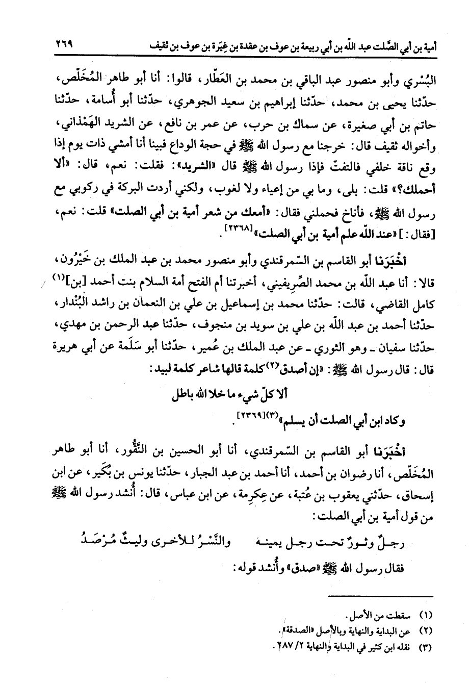 البسري وأبو منصور عبد الباقي بن محمد بن العطار قالوا أنا أبو طاهر المخلص حدثنا يحيى بن محمد حدثنا إبراهيم بن سعيد الجوهري حدثنا أبو أسامة حدثنا حاتم بن أبي صغيرة عن سماك بن حرب عن عمر بن نافع عن الشريد الهمذاني وأخواله ثقيف قال خرجنا مع رسول الله (صلى الله عليه وسلم) في حجة الوداع فبينا أنا أمشي ذات يوم إذا وقع ناقة خلفي فالتفت فإذا رسول الله (صلى الله عليه وسلم) قال الشريد فقلت نعم قال ألا أحملك قلت بلى وما بي من أعياء ولا لغوب ولكني أردت البركة في ركوبي مع رسول الله (صلى الله عليه وسلم) فأناخ فحملني فقال أمعك من شعر أمية بن أبي الصلت قلت نعم فقال عند الله علم أمية بن أبي الصلت أخبرنا أبو القاسم بن السمرقندي وأبو منصور محمد بن عبد الملك بن خيرون قالا أنا عبد الله بن محمد الصريفيني أخبرتنا أم الفتح أمة السلام بنت أحمد بن (1) كامل القاضي قالت حدثنا محمد بن إسماعيل بن علي بن النعمان بن راشد البندار حدثنا أحمد بن عبد الله بن علي بن سويد بن منجوف حدثنا عبد الرحمن بن مهدي حدثنا سفيان وهو الثوري عن عبد الملك بن عمير حدثنا أبو سلمة عن أبي هريرة قال قال رسول الله (صلى الله عليه وسلم) إن أصدق (2) كلمة قالها شاعر كلمة لبيد * ألا كل شئ ما خلا الله باطل وكاد ابن أبي الصلت أن يسلم (3) أخبرنا أبو القاسم بن السمرقندي أنا أبو الحسين بن النقور أنا أبو طاهر المخلص أنا رضوان بن أحمد أنا أحمد بن عبد الجبار حدثنا يونس بن بكير عن ابن إسحاق حدثني يعقوب بن عتبة عن عكرمة عن ابن عباس قال أنشد رسول الله (صلى الله عليه وسلم) من قول أمية بن أبي الصلت * رجل وثور تحت رجل يمينه * والنسر للأخرى وليث مرصد * فقال رسول الله (صلى الله عليه وسلم) صدق وأنشد قوله