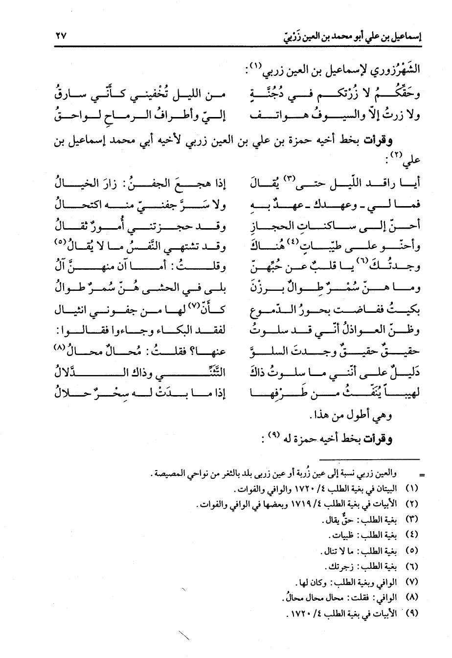 الشهرزوري لإسماعيل بن العين زربي (1) * وحقكم لا زرتكم في دجنة * من الليل تخفيني كأني سارق ولا زرت إلا والسيوف هواتف * إلي وأطراف الرماح لواحق * وقرأت بخط أخيه حمزة بن علي بن العين زربي لأخيه أبي محمد إسماعيل بن علي (2) * أيا راقد الليل حتى (3) يقال * إذا هجع الجفن زار الخيال فمالي وعهدك عهد به * ولا سر جفني منه اكتحال أحن إلى ساكنات الحجاز * وقد حجزتني أمور ثقال * * وأحنو على طيبات (4) هناك * وقد تشتهي النفس ما لا يقال (5) وجدتك (6) يا قلب عن حبهن * وقلت أما آن منهن آل وما هن سمر طوال برزن * بلى في الحشى هن سمر طوال بكيت ففاضت بحور الدموع * كأن (7) لها من جفوني انثيال وظن العواذل أني قد سلوت * لفقد البكاء وجاءوا فقالوا حقيق حقيق وجدت السلو * عنها فقلت محال محال (8) دليل على أنني ما سلوت ذاك * التثني وذاك الدلال لهيبا ينفث من طرفها * إذا ما بدت له سحر حلال * وهي أطول من هذا وقرأت بخط أخيه حمزة له (9)
