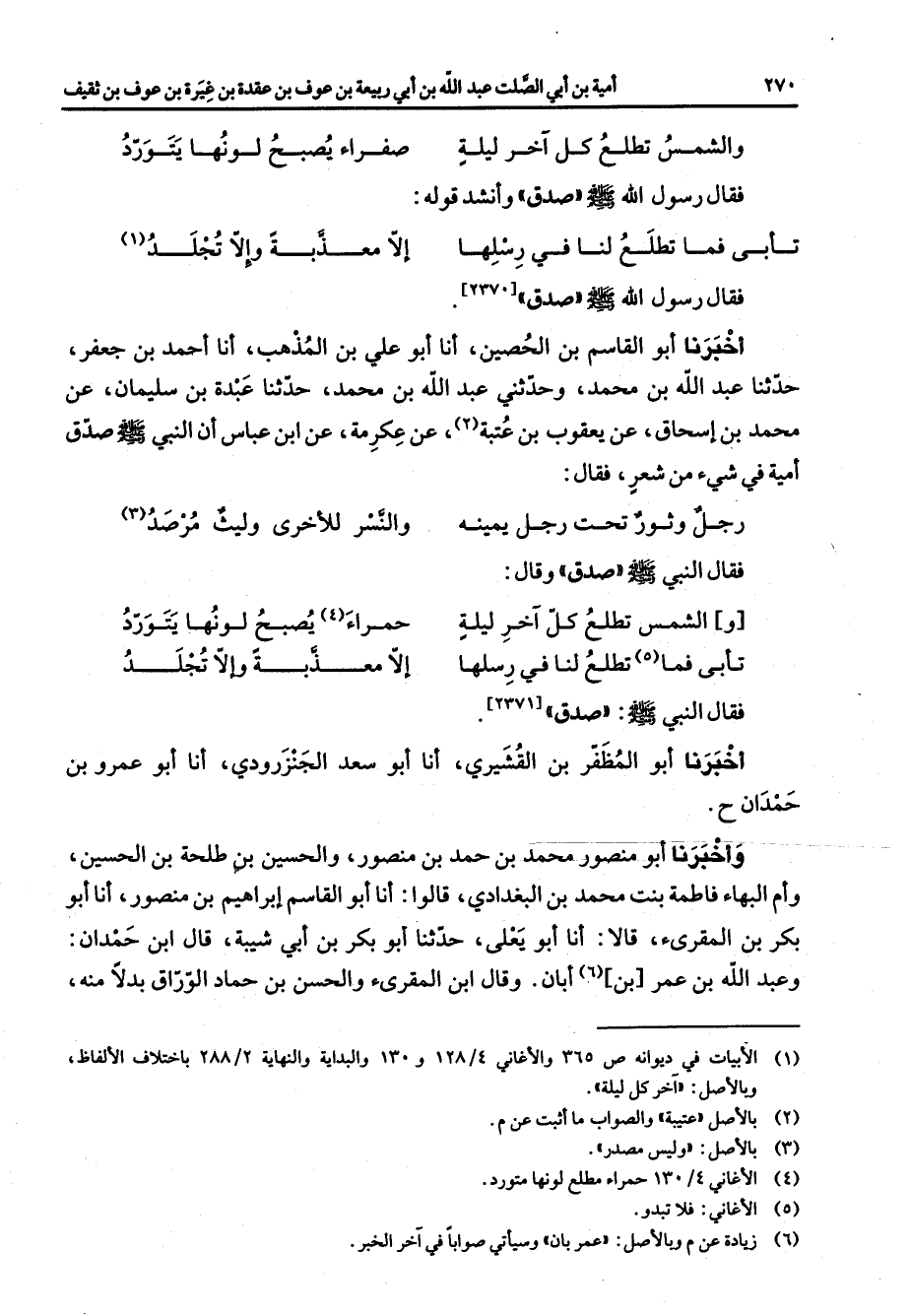 * والشمس تطلع كل آخر ليلة * صفراء يصبح لونها يتورد * فقال رسول الله (صلى الله عليه وسلم) صدق وأنشد قوله * تأبى فما تطلع لنا في رسلها * إلا معذبة وإلا تجلد (1) * فقال رسول الله (صلى الله عليه وسلم) صدق أخبرنا أبو القاسم بن الحصين أنا أبو علي بن المذهب أنا أحمد بن جعفر حدثنا عبد الله بن محمد وحدثني عبد الله بن محمد حدثنا عبدة بن سليمان عن محمد بن إسحاق عن يعقوب بن عتبة (2) عن عكرمة عن ابن عباس أن النبي (صلى الله عليه وسلم) صدق أمية في شئ من شعر فقال * رجل وثوق تحت رجل يمينه * والنسر للأخرى وليث مرصد (3) * فقال النبي (صلى الله عليه وسلم) صدق وقال * والشمس تطلع كل آخر ليلة * حمراء (4) يصبح لونها يتورد تأبى فما (5) تطلع لنا في رسلها * إلا معذبة وإلا تجلد * فقال النبي (صلى الله عليه وسلم) صدق أخبرنا أبو المظفر بن القشيري أنا أبو سعد الجنزرودي أنا أبو عمرو بن حمدان ح وأخبرنا أبو منصور محمد بن حمد بن منصور والحسين بن طلحة بن الحسين وأم البهاء فاطمة بنت محمد بن البغدادي قالوا أنا أبو القاسم إبراهيم بن منصور أنا أبو بكر بن المقرئ قالا أنا أبو يعلى حدثنا أبو بكر بن أبي شيبة قال ابن حمدان وعبد الله بن عمر (6) بن أبان وقال ابن المقرئ والحسن بن حماد الوراق بدلا منه