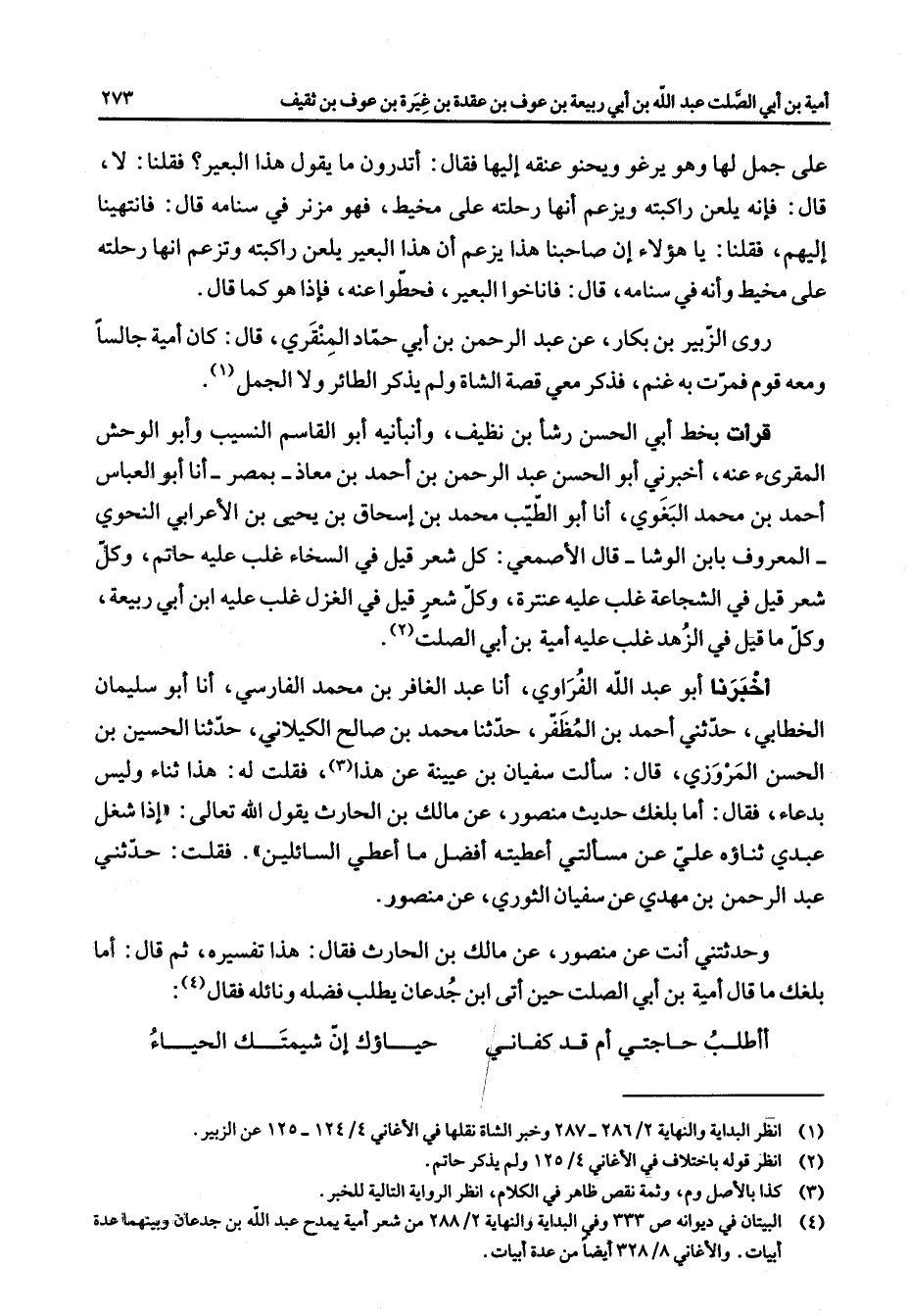 على جمل لها وهو يرغو ويحنو عنقه إليها فقال أتدرون ما يقول هذا البعير فقلنا لا قال فإنه يلعن راكبته ويزعم أنها رحلته على مخيط فهو مزنر في سنامه قال فانتهينا إليهم فقلنا يا هؤلاء إن صاحبنا هذا يزعم أن هذا البعير يلعن راكبته وتزعم أنها رحلته على مخيط وأنه في سنامه قال فأناخوا البعير فحطوا عنه فإذا هو كما قال روى الزبير بن بكار عن عبد الرحمن بن أبي حماد المنقري قال كان أمية جالسا ومعه قوم فمرت به غنم فذكر معي قصة الشاة ولم يذكر الطائر ولا الجمل (1) قرأت بخط أبي الحسن رشأ بن نظيف وأنبأنيه أبو القاسم النسيب وأبو الوحش المقرئ عنه أخبرني أبو الحسن عبد الرحمن بن أحمد بن معاذ بمصر أنا أبو العباس أحمد بن محمد البغوي نا أبو الطيب محمد بن إسحاق بن يحيى بن الإعرابي النحوي المعروف بابن الوشا قال الأصمعي كل شعر قيل في السخاء غلب عليه حاتم وكل شعر قيل في الشجاعة غلب عليه عنترة وكل شعر قيل في الغزل غلب عليه ابن أبي ربيعة وكل ما قيل في الزهد غلب عليه أمية بن أبي الصلت (2) أخبرنا أبو عبد الله الفراوي أنا عبد الغافر بن محمد الفارسي أنا أبو سليمان الخطابي حدثني أحمد بن المظفر حدثنا محمد بن صالح الكيلاني حدثنا الحسين بن الحسن المروزي قال سألت سفيان بن عيينة عن هذا (3) فقلت له هذا ثناء وليس بدعاء فقال أما بلغك حديث منصور عن مالك بن الحارث يقول الله تعالى إذا شغل عبدي ثناؤه علي عن مسألتي أعطيته أفضل ما أعطي السائلين فقلت حدثني عبد الرحمن بن مهدي عن سفيان الثوري عن منصور وحدثني أنت عن منصور عن مالك بن الحارث فقال هذا تفسيره ثم قال أما بلغك ما قال أمية بن أبي الصلت حين أتى ابن جدعان يطلب فضله ونائله فقال (4) * أأطلب حاجتي أم قد كفاني * حياك إن شيمتك الحياء